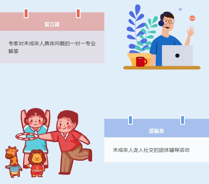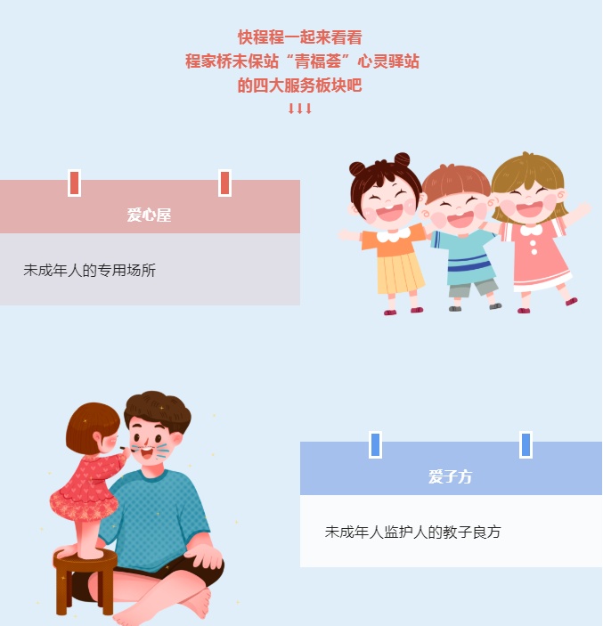 “青福荟”心灵驿站作为程家桥街道未保工作站服务的新载体,通过“四爱”——爱心屋、爱子方、爱言谈、爱福荟四大服务板块,开展全方位的未成年人心理健康关爱服务,积极探索街道未成年人心理健康教育与危机干预服务的本土化创新模式,促进区域层面家—社—校—医互助联动机制的构建,共同为区域内未成年人及其监护人家庭提供人性化的心理健康服务,护航未成年人身心健康成长。