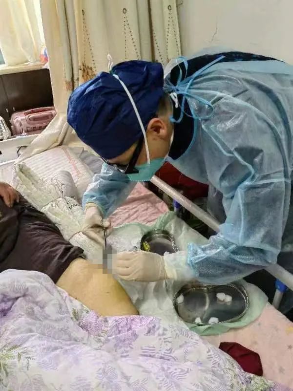 殷健、曹阳医生主刀为戚阿婆做了微创手术。手术非常顺利,术后恢复一周,家属决定先带戚阿婆回家休养。转眼间,拆线的时间就要到了,但却碰到了近期的特殊情况,家属一方面怕到时叫不到救护车,更怕到医院老人会感染病毒,就抱着试试看的心态联系殷健。