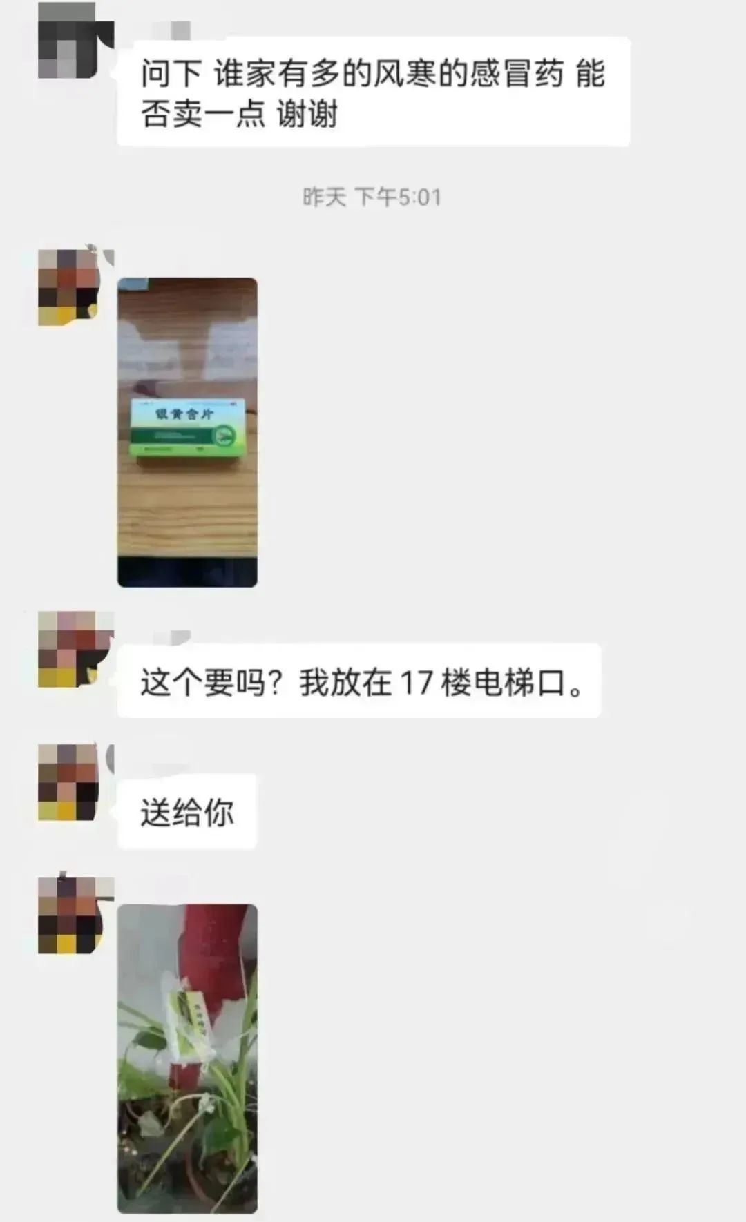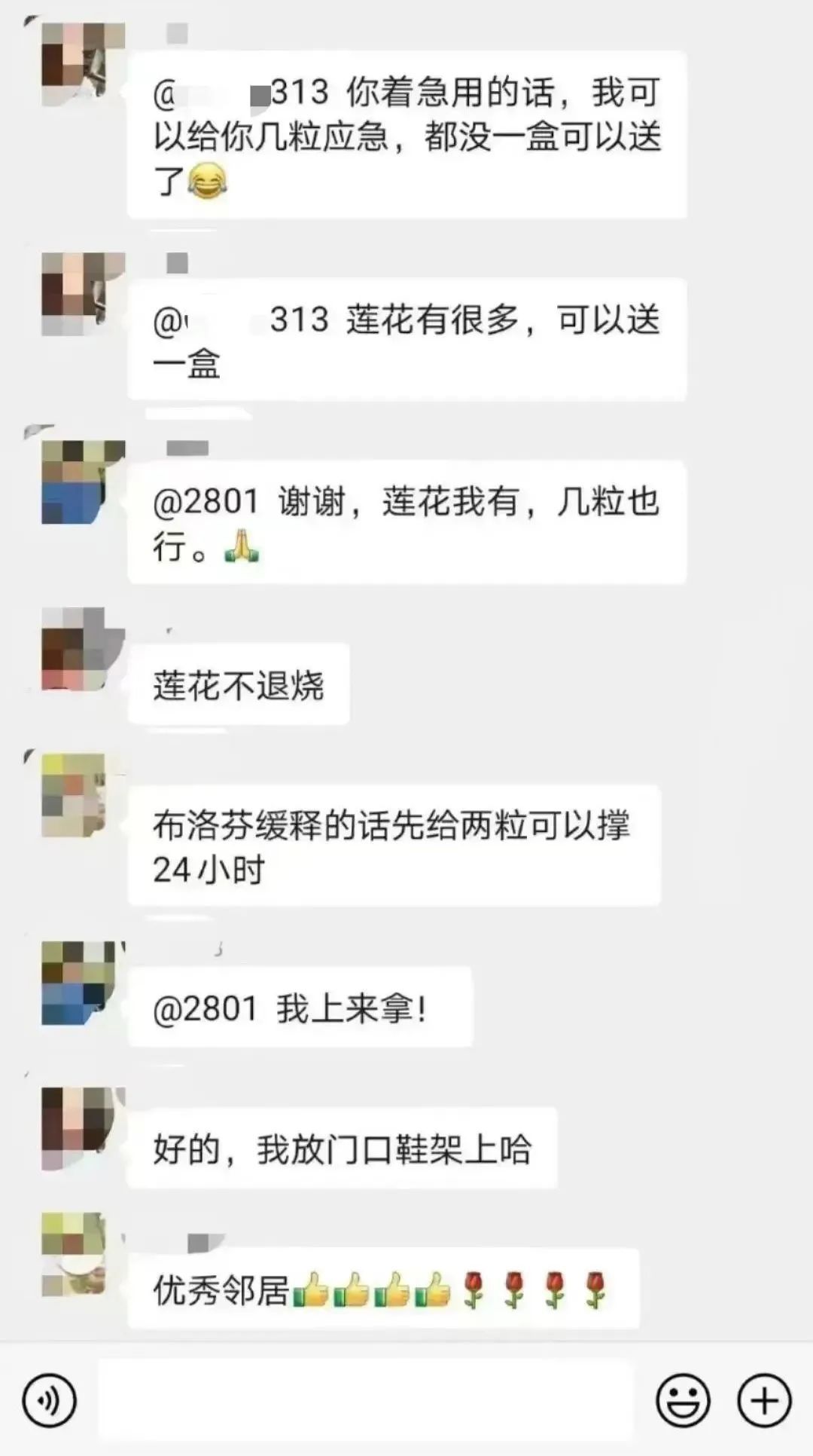 让刘彬彬没想到的是,他22点27分发出求助信息,没过一会多位居民都表示有多余的药可以“支援”。22点40分左右,刘彬彬听到敲门声,当他打开门时,发现铁门上挂着一个袋子,里面有1盒感冒灵冲剂和用纸巾包裹的6颗布洛芬胶囊。