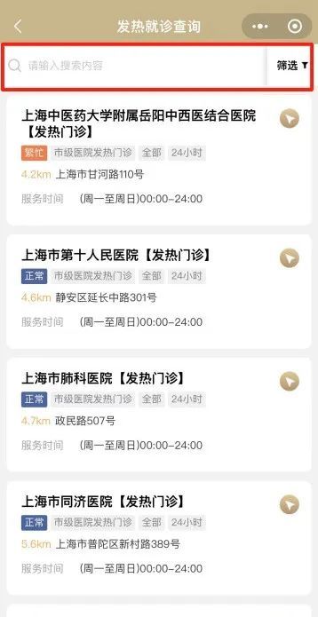 3、在搜索框输入发热就诊点位名称或相关关键字,也可点击右上角的“筛选”按钮,通过选择“所在区”、“医院级别”,或以“服务对象”、“是否24小时”或“医院状态”更多选项,筛选附近的发热就诊点位。