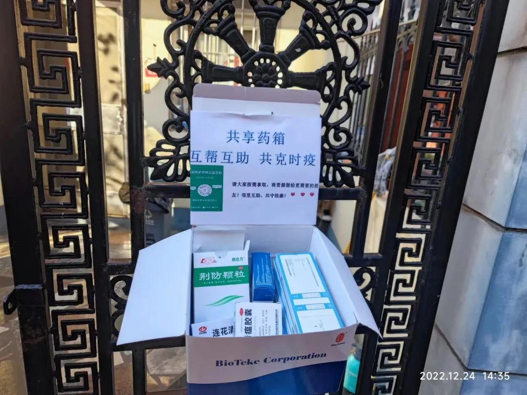 考虑到近日疫情反复,桂康居委在小区门口设置“共享小药箱”,为有紧急需求的居民们提供连花清瘟、抗原等紧缺物资,同时在网格群里倡导居民们使用药物共享小程序,实现“互帮互助,共克难关”“邻里互助,共守桂康”。