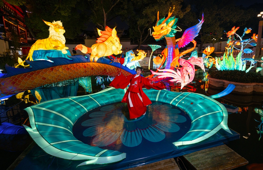 漫步在豫园老街,是“奇豫上博”的联袂呈现,当灯会遇见了博物馆,看灯也能大涨知识。仰头所见,是无数锦鲤游弋飞跃,仿佛鸿运当头。这些锦鲤各个来头不小,正是出自上海博物馆的馆藏文物珍品。门头“空中龙门”灯组,源自李在名画《琴高乘鲤图》,锦鲤、龙门、江涛,画中元素以灯彩形式重现,祥瑞之气扑你一个满怀。
