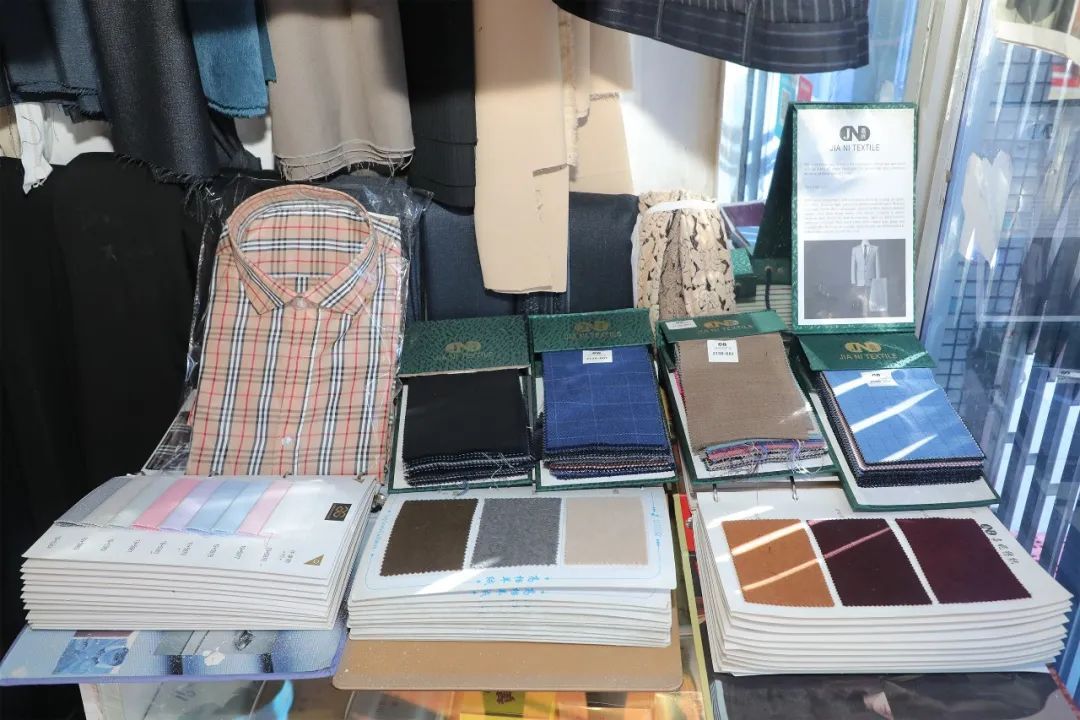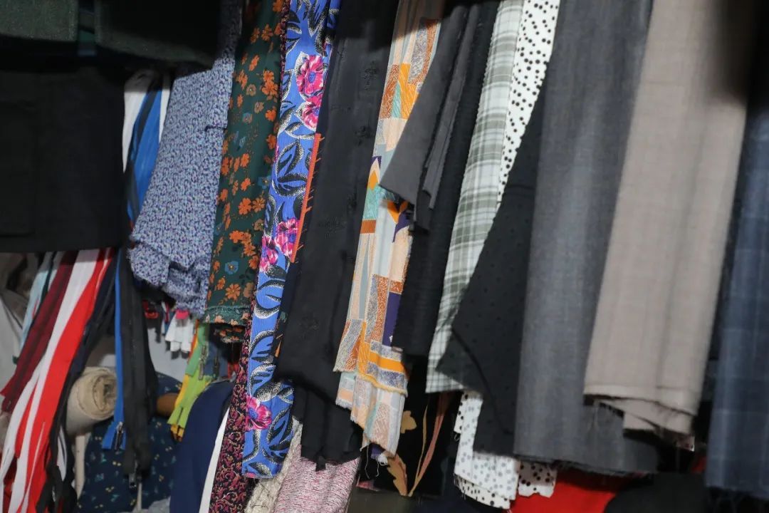有了工具,更要有布料。店里存放了材质各异的面料,有适合春夏穿的纯棉、雪纺、亚麻,也有秋冬季节的羊绒、毛呢等。“像这种毛涤面料的质量就比较好,常用来做西装。”黄春华介绍道。