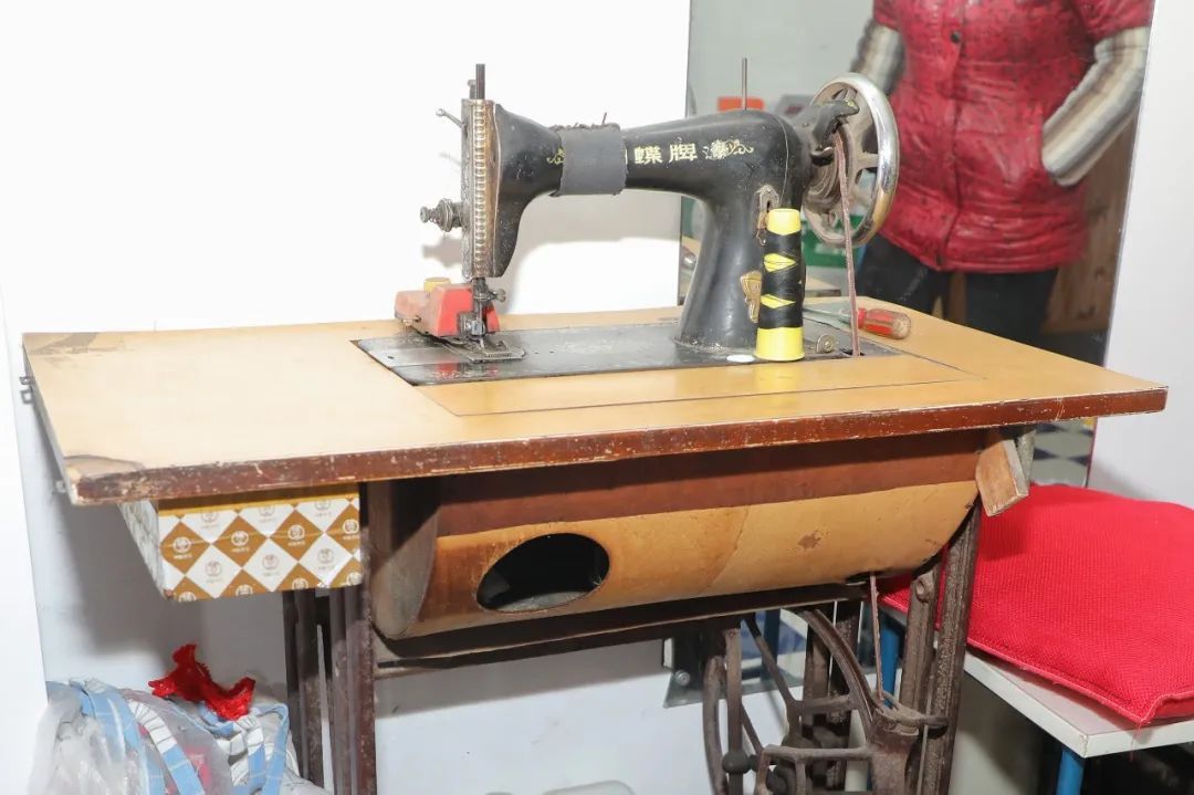 做衣服常用的工具包括两台缝纫机、一台锁边机、一台撬边机、熨斗、尺子等。常用的那台缝纫机摆放在进门处,缝纫速度快,是用的最多的。另一台是在那个年代潮得很的蝴蝶牌缝纫机,摆在店里面,是黄春华初学时使用的。“毕竟跟着我二三十年了,舍不得扔,偶尔还能用用。”