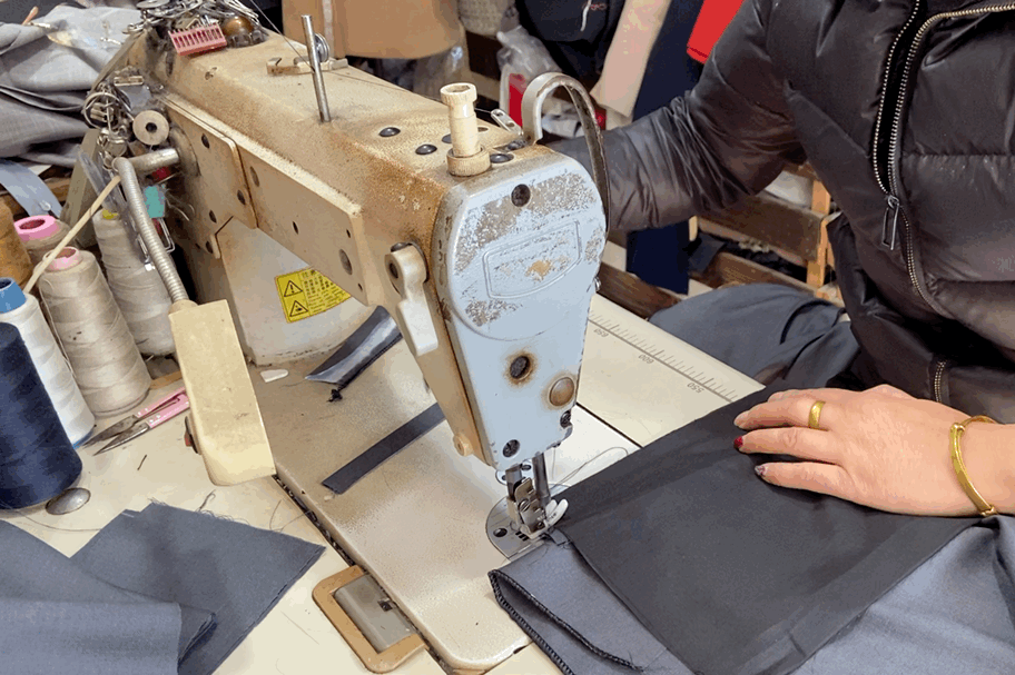 锁边机正将西裤的边缘用线锁住,防止毛边。