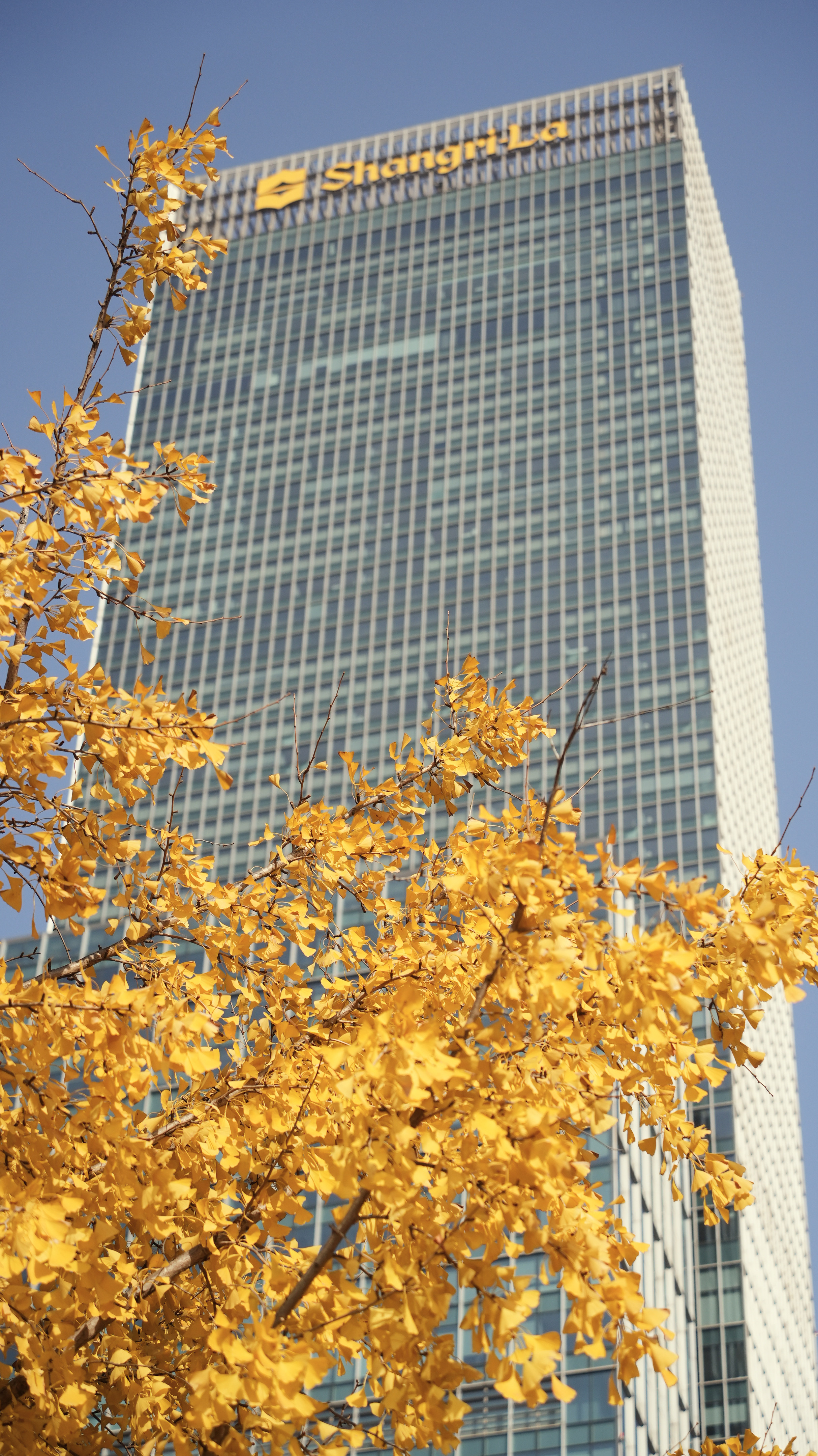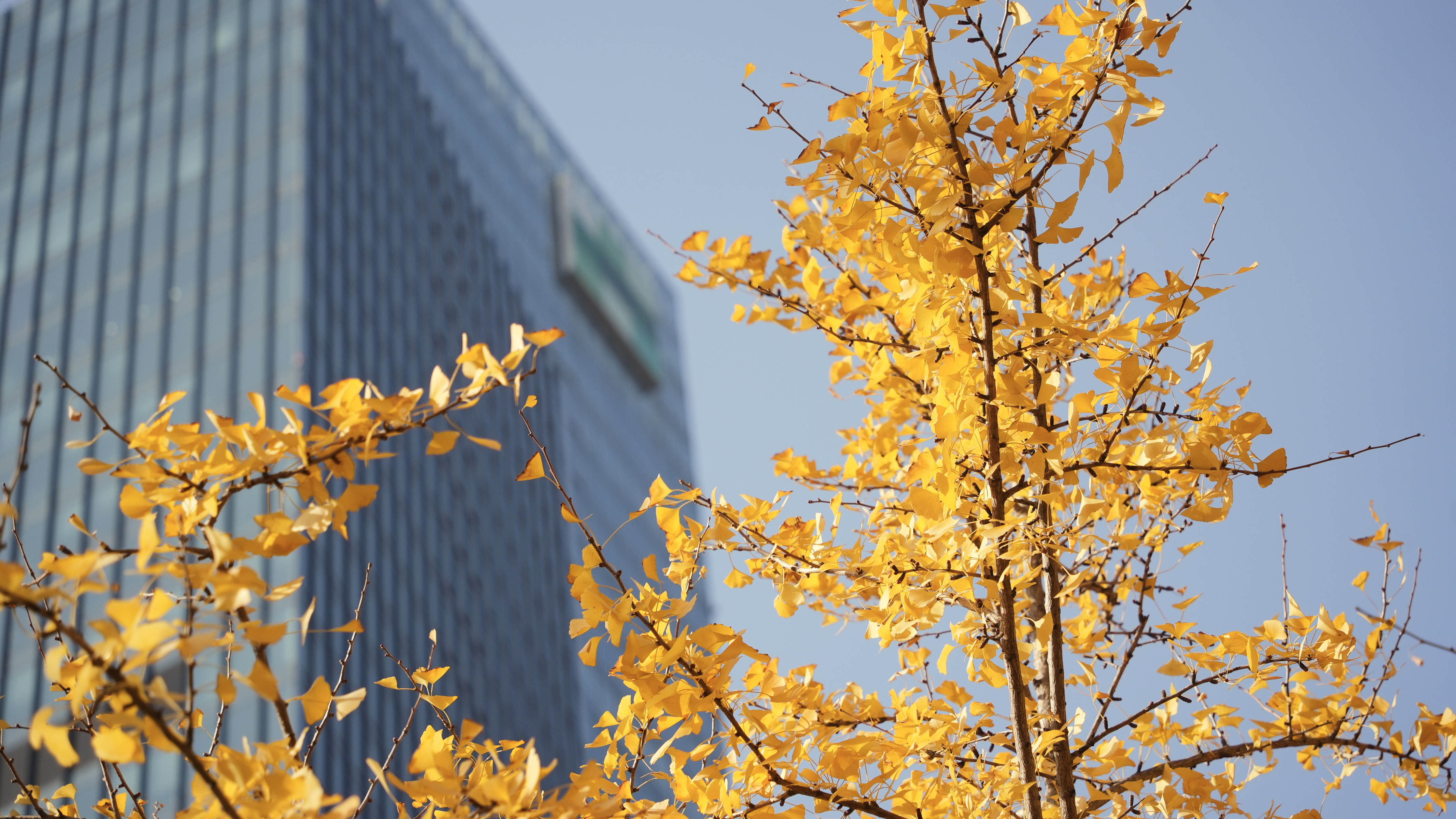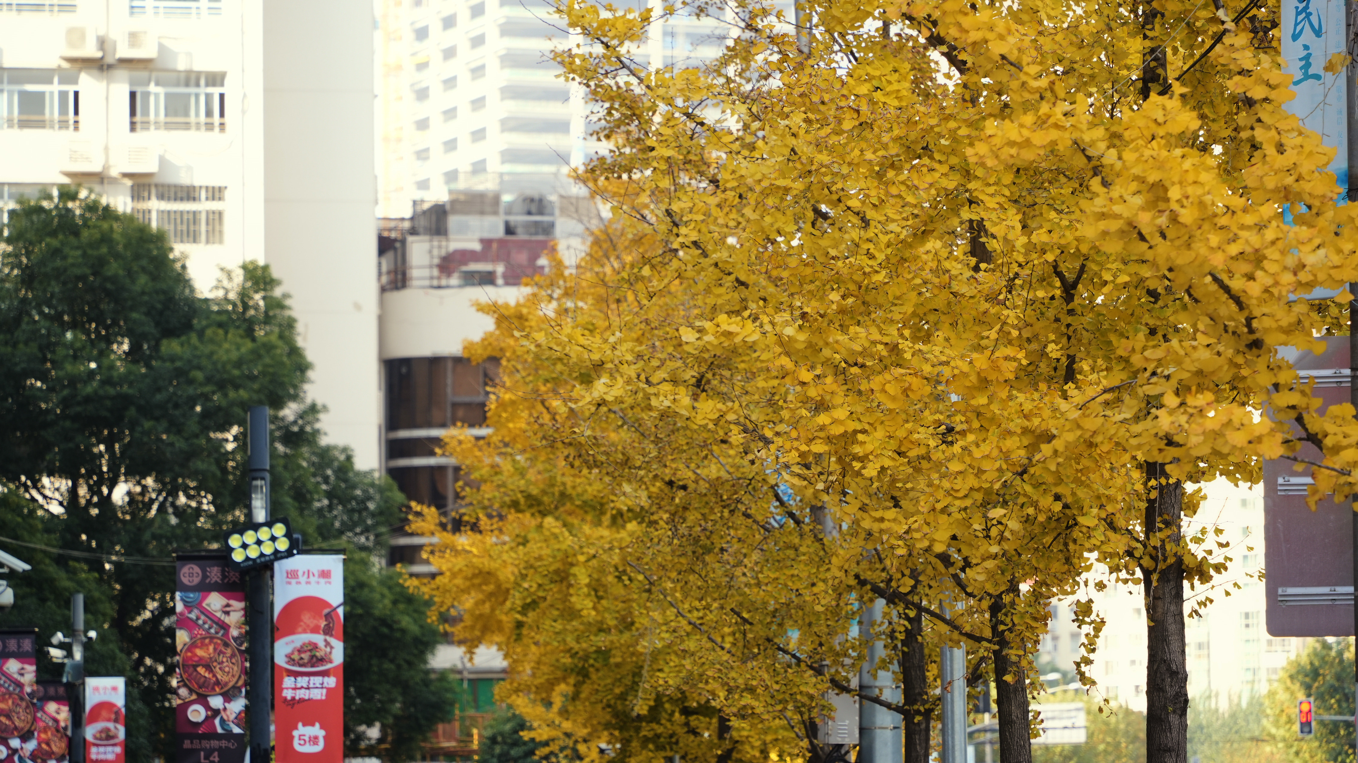 这片“银杏海”东西两侧分别为静安嘉里中心和越洋国际广场两幢高楼,南侧则是车辆川流不息的延安高架路和常德路延安中路路口。