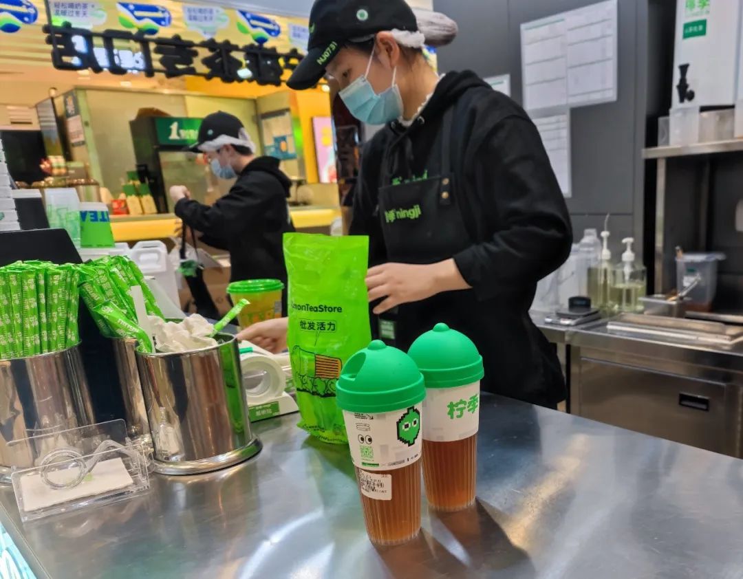 可能是地理位置不错的原因,这家店的生意肉眼可见的好。虽然是工作日的午后,柜台上放了一排准备取用的柠檬茶,陆陆续续还有顾客现场点单,热度远超附近的奶茶店。