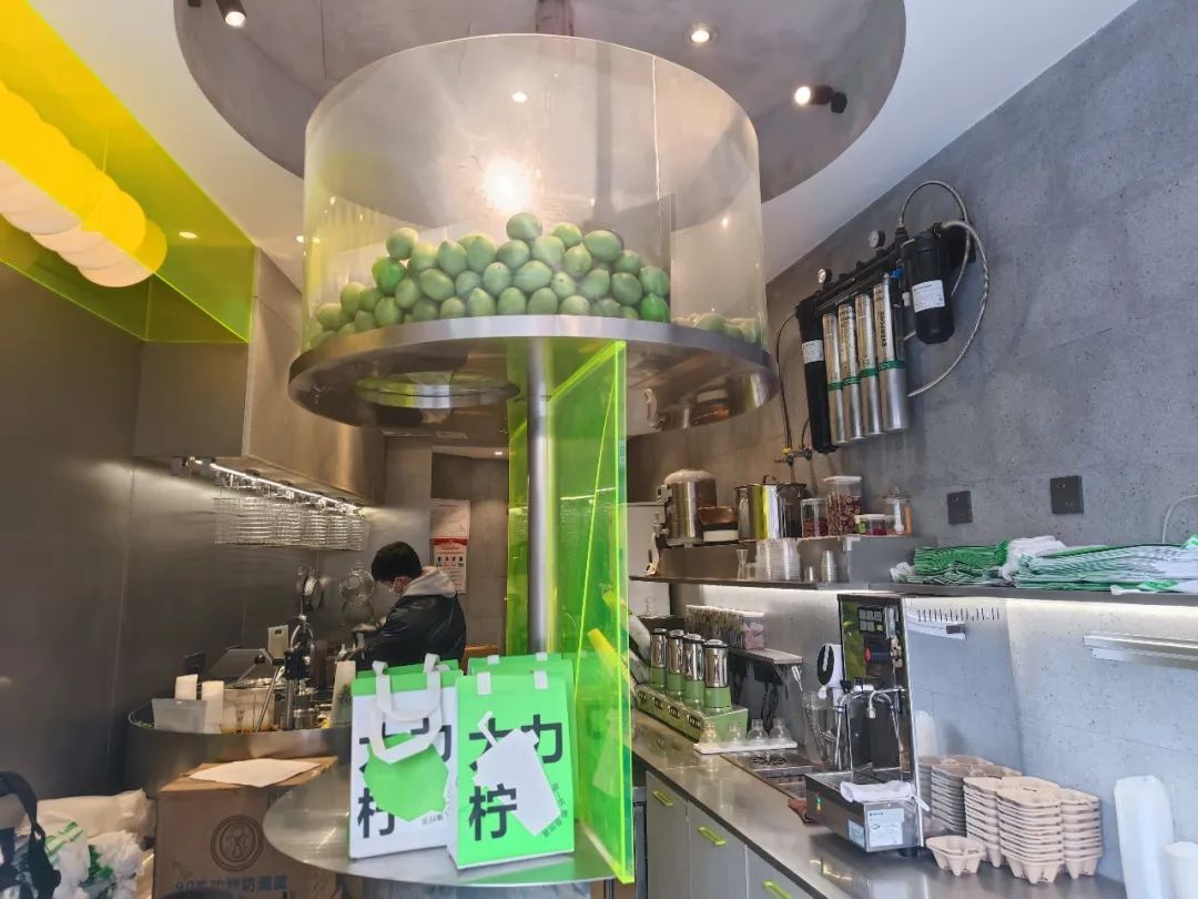 最后一站是“大力柠”——因为是街边店的缘故,这里来往的顾客不多,但是放在桌上的外卖并不少。装修的风格很现代,高处还放着不少绿色的香水柠檬。