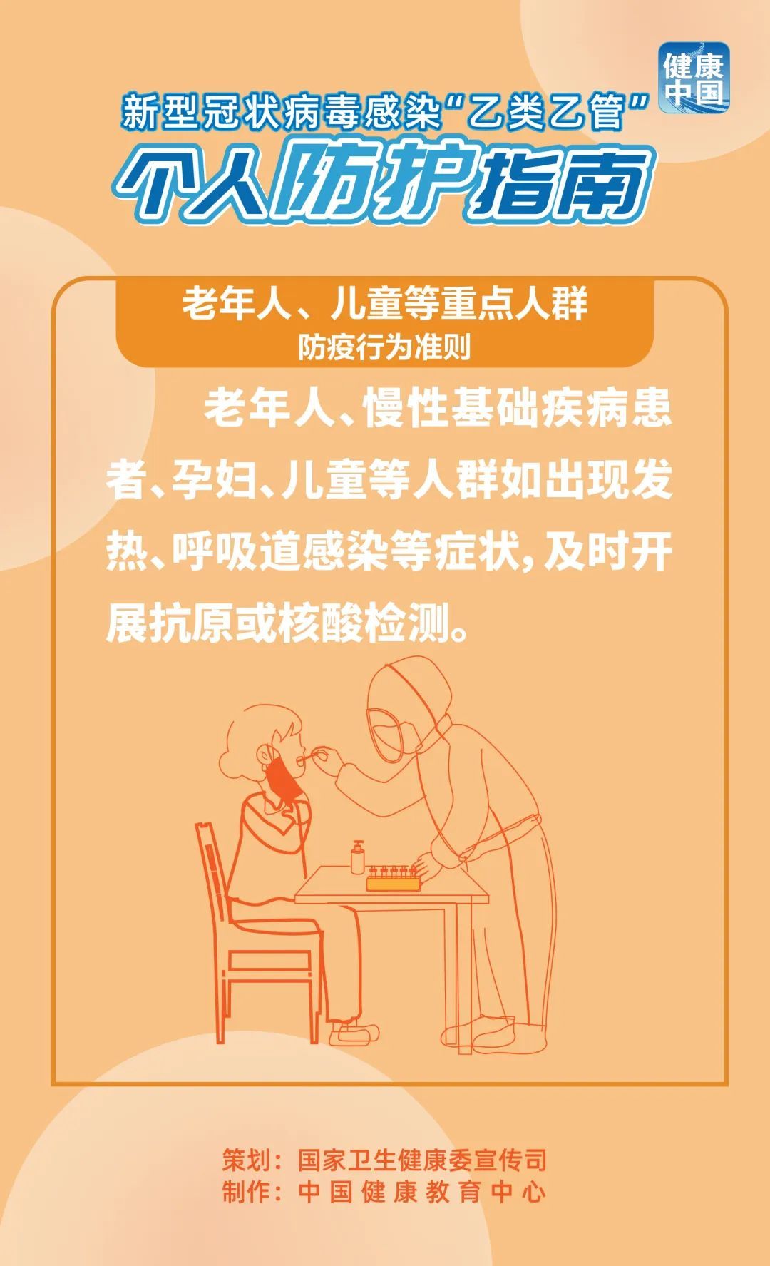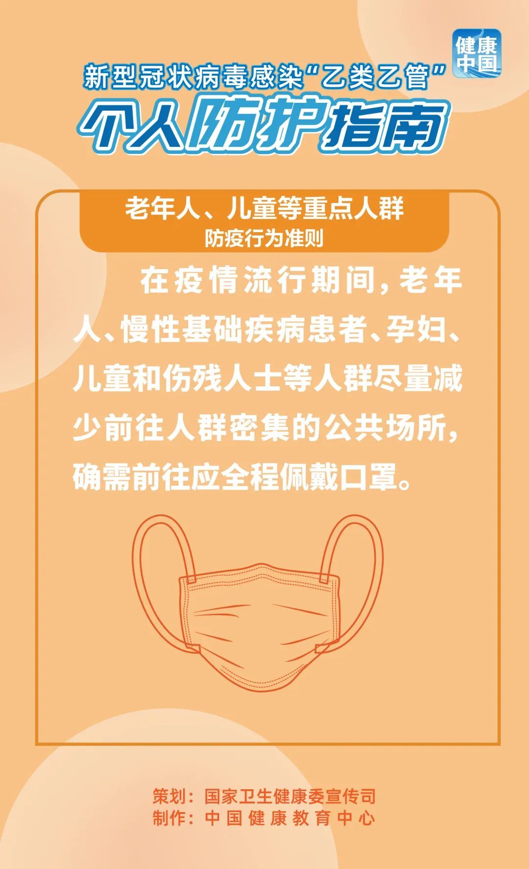 新型冠状病毒感染“乙类乙管”后,老年人、儿童等重点人群应怎样做好个人防护?来看国家卫健委的这份个人防护指南,详见↓