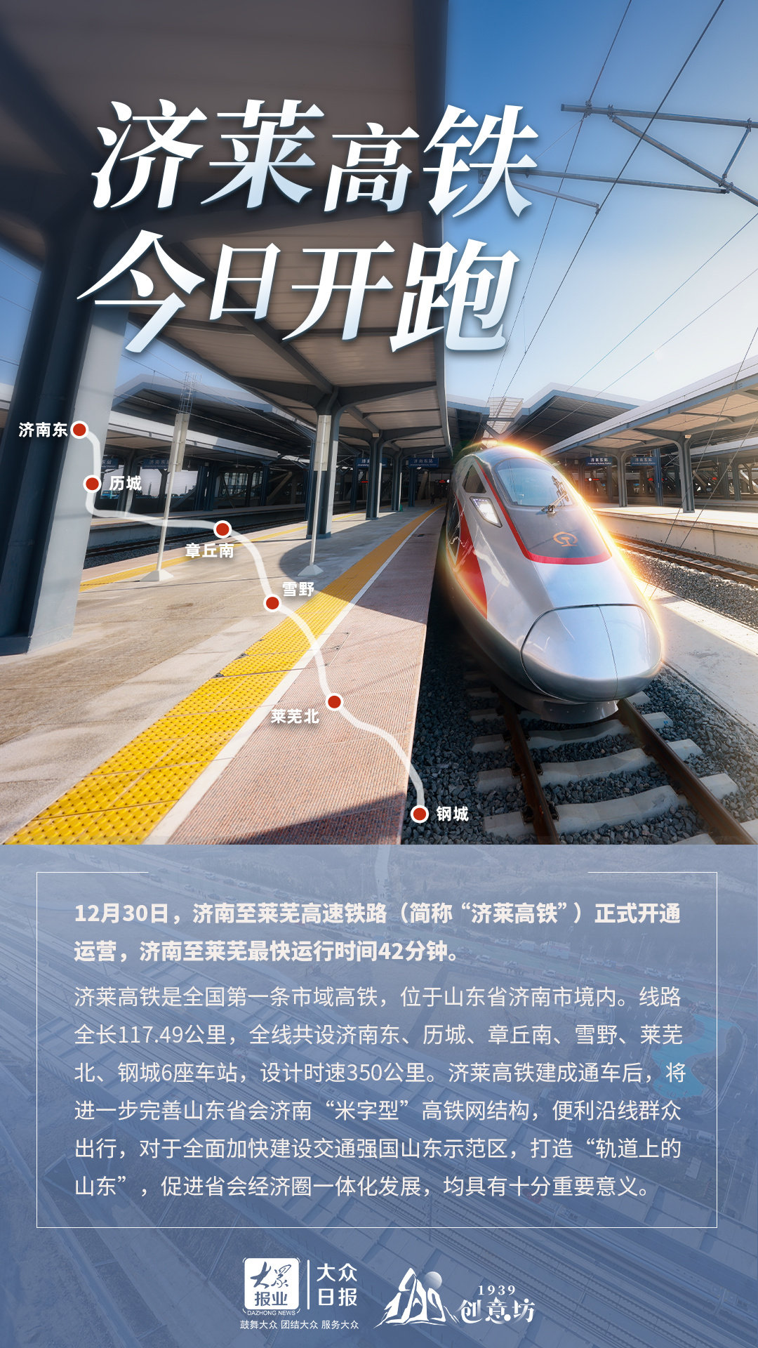 12月30日10时38分,G9230次首发动车组列车从雪野站开出,标志着济南至莱芜高速铁路(简称“济莱高铁”)正式开通运营,济南至莱芜最快运行时间42分钟,济南市莱芜区、钢城区结束不通高铁历史。