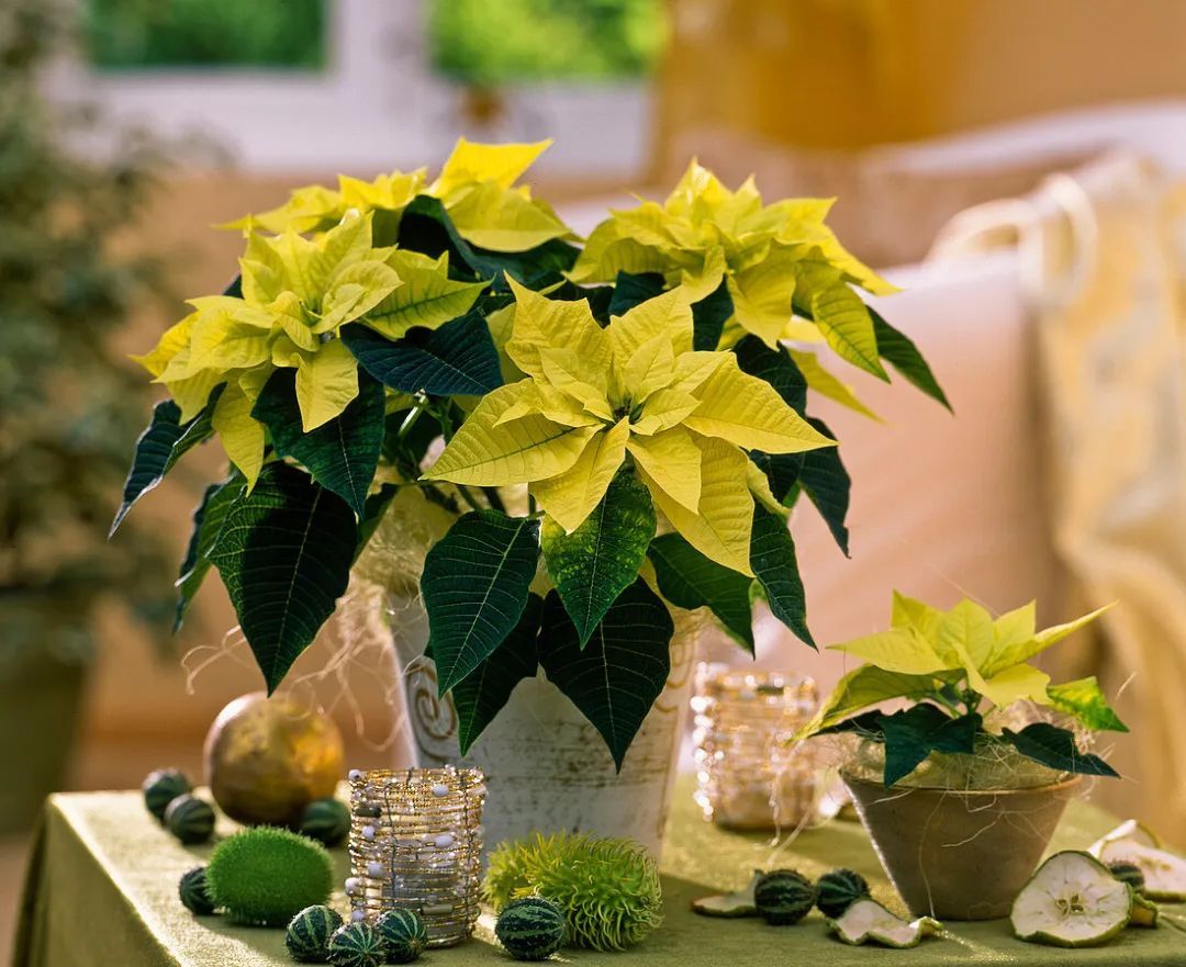 叶面金色的一品红一般是喷漆喷上去的,或者直接是仿真花,目前还没有金叶的一品红品种,不过有苞片是黄色的一品红品种,此外还有白色的、粉色的等一些色彩特殊的一品红品种,不过市面上较为少见,可以在网上看看有没有。