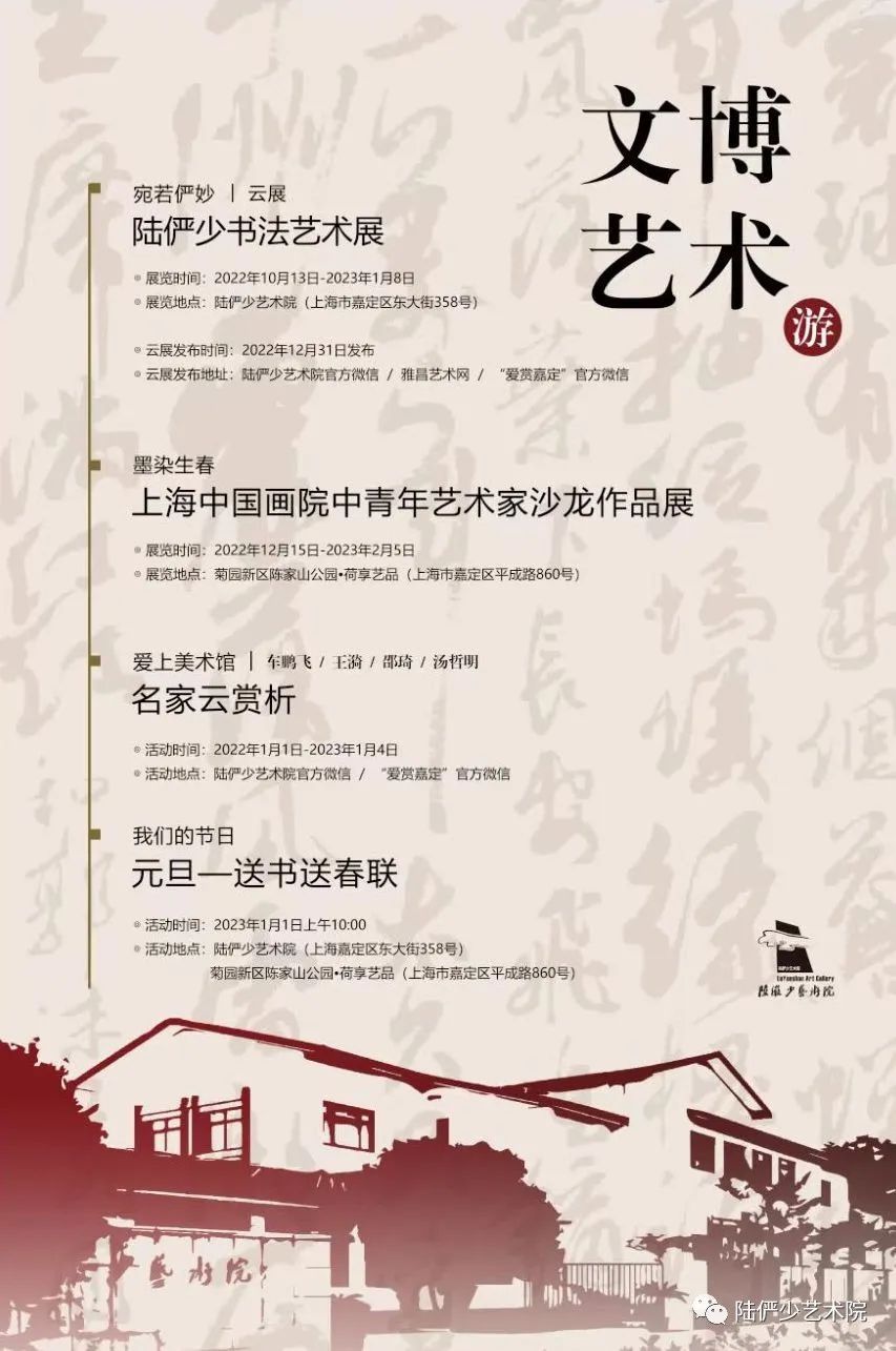为喜迎元旦,1月1日,陆俨少艺术院特开展【我们的节日】“陆俨少艺术院元旦送书送春联活动”,准备了精美春联与艺术书籍在陆俨少艺术院与陈家山荷花公园·荷享艺品展厅一楼门厅处免费发放,欢迎市民朋友前往参观。
