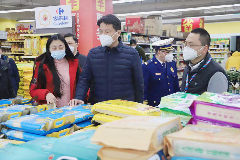 在真北家乐福,姜冬冬、姜爱锋一行实地察看果蔬、水产、米面粮油等多个销售区,并参观储备仓库和消防控制室,询问了解货源渠道、稳价保供、食品安全、消防安全等情况。姜冬冬说,在保障市场供应、保供稳价的同时,要进一步加强企业内部管理,守牢食品质量安全底线。