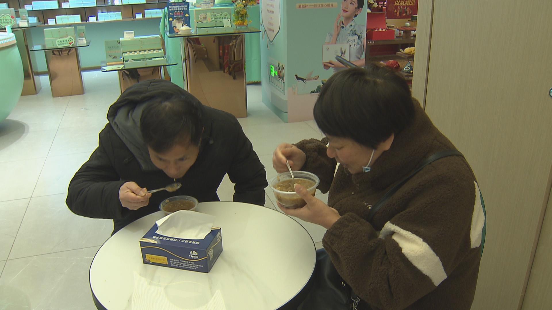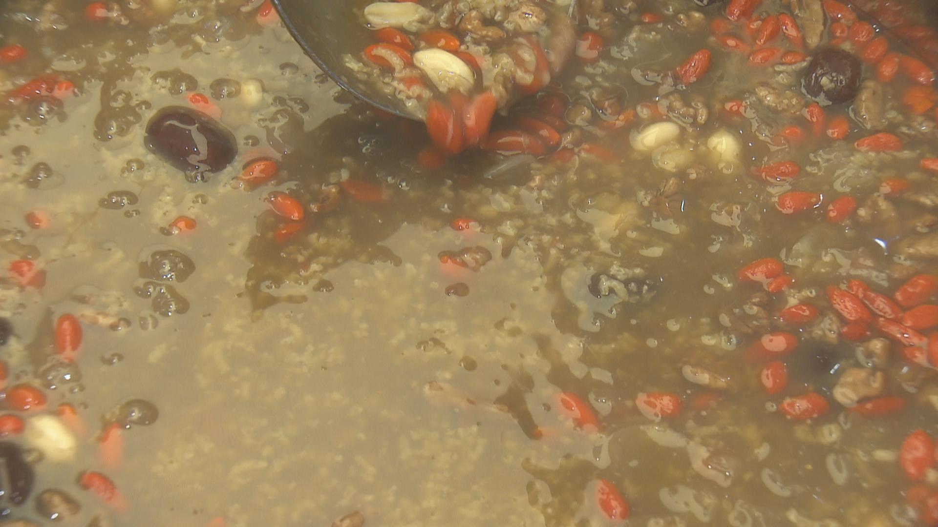“我们的粥三天前就准备了,米都是泡了一夜,大厨早上四点就起来熬制,才会特别地粘稠。因为今年当下疫情,还是很多咳嗽的大病初愈的顾客。我们腊八粥糖的量是减低了,一让大家不要有湿热产生痰。第二个,我们里面加了一些莲子、茯苓、枸杞这些温补清热的东西,综合了一下我们药效,有食补的效果。” 童涵春堂庙童店市场经理徐文婷告诉记者。