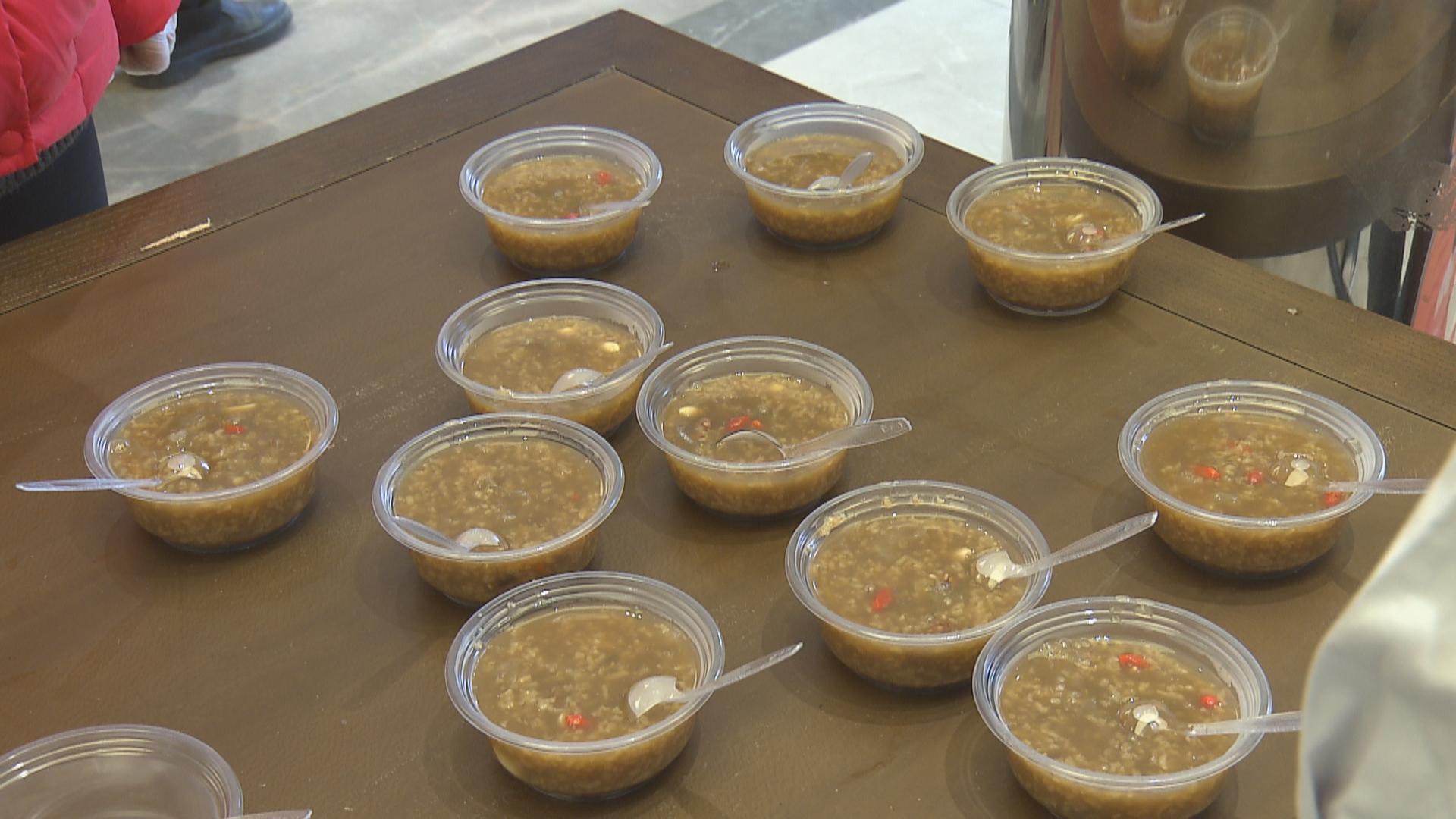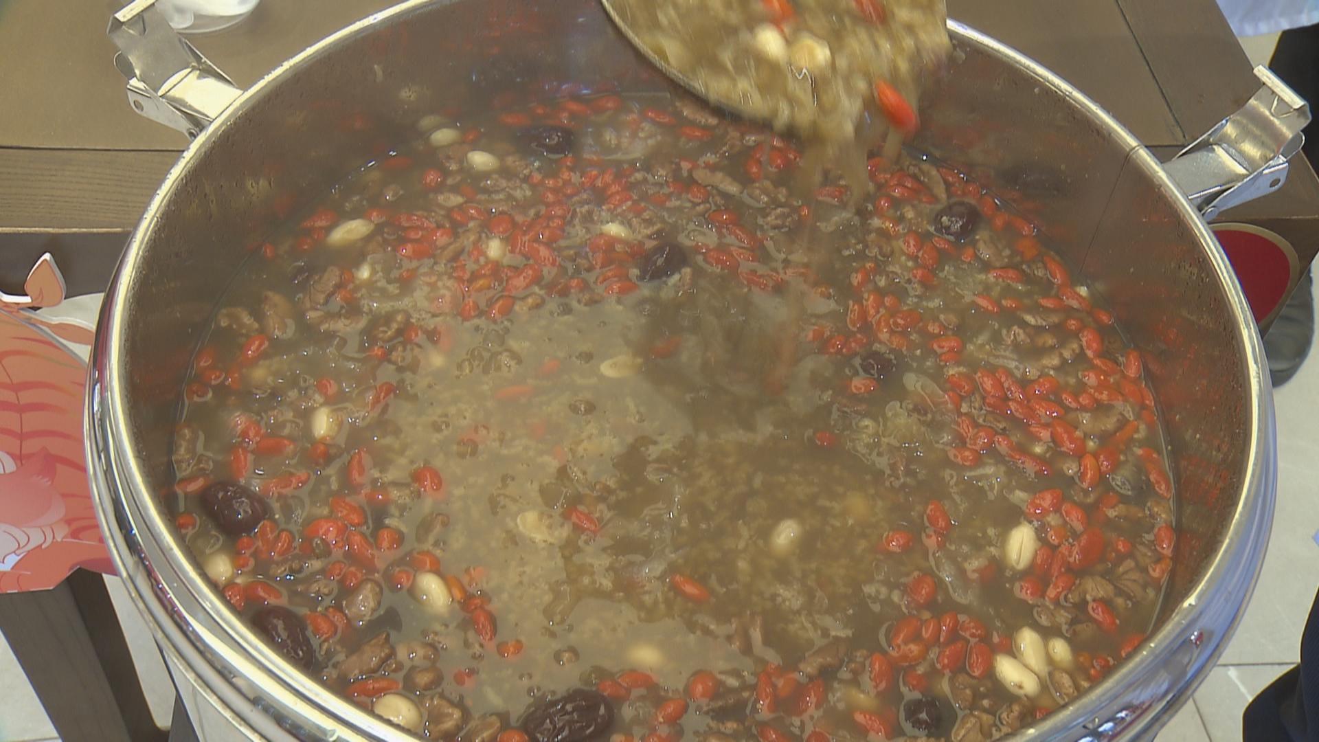 今年由于疫情,作为老字号的中药品牌连锁店童涵春堂的腊八粥还加入了杏仁、淮山、莲子肉、薏仁、白果、赤豆、枸杞、茯苓等中药材,营养价值高,有健脾养胃、补中益气的作用。同时也降低了粥的糖分,让腊八粥更具补气润肺的功效,更适合“阳康”人群。大厨从早上4点就开始熬制,总共准备了4大桶,大约有600余份。