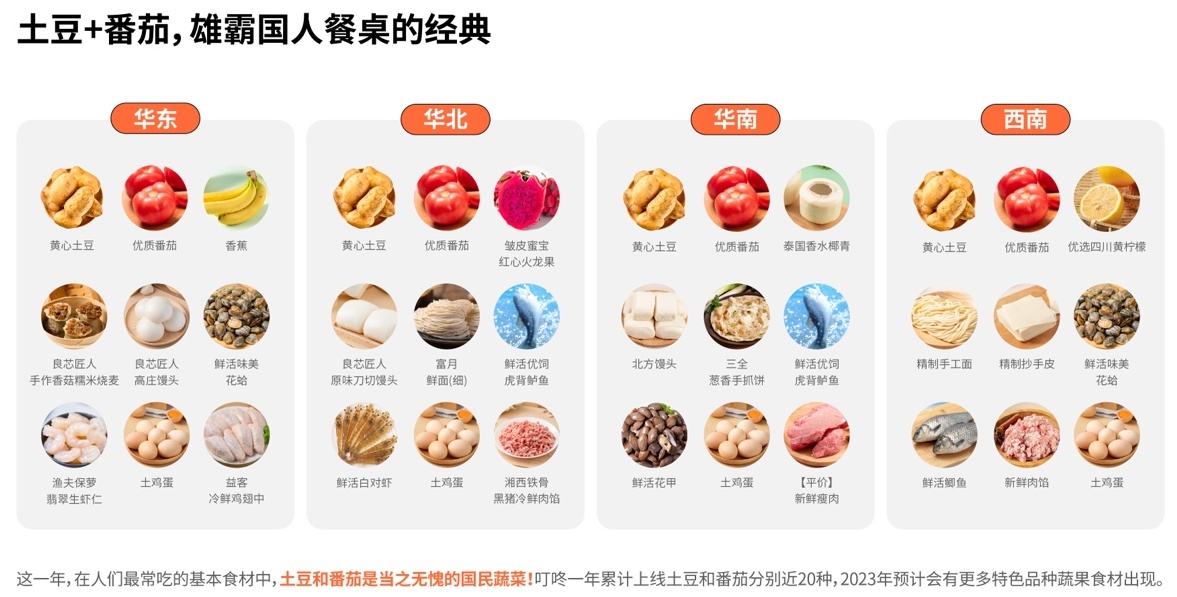 而对于蔬菜,不管是东南西北,土豆和番茄都是用户餐桌上当之无愧的“顶流”。虽然是基础蔬菜,但是不同口感差异的品种选择却悄然多了起来,过去一年,叮咚买菜平台上累计销售过的土豆和番茄品种分别将近20种,其中,叮咚买菜推出的特色品种比如轻食土豆、富硒土豆、卡酷奇番茄等等,都颇受消费者的认可,煎炒烹炸,总有一款口感适合不同人的味蕾。