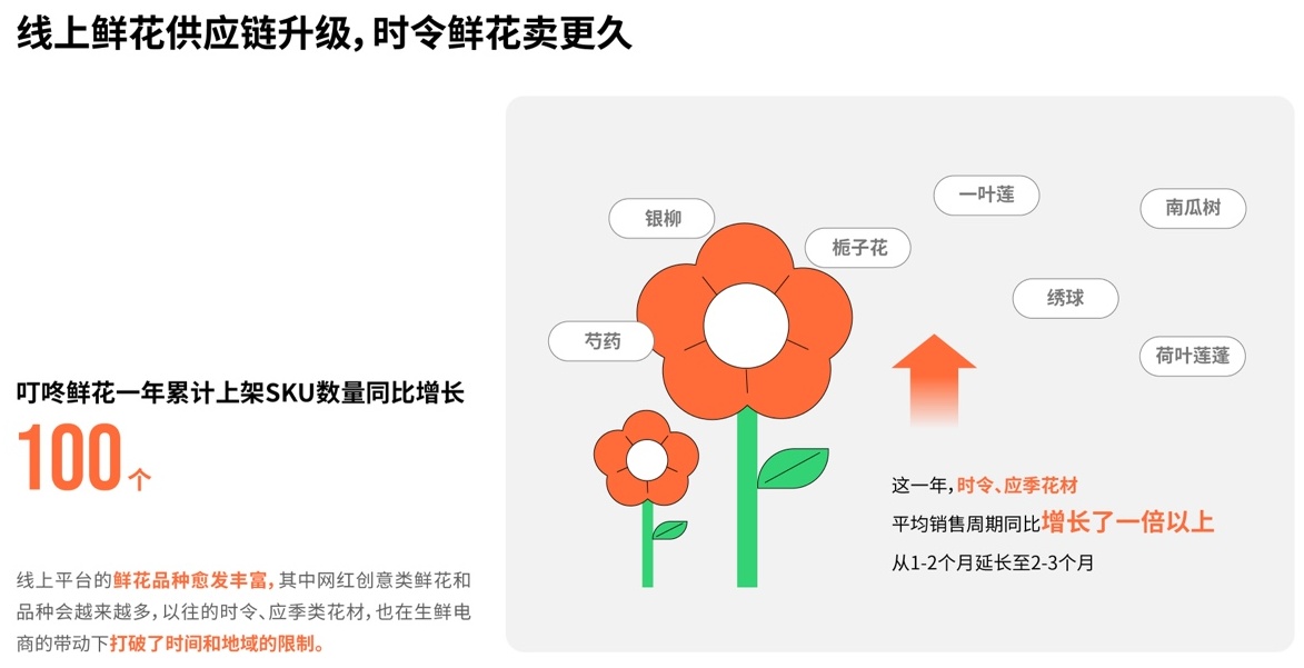 报告显示,过去一年,叮咚买菜平台鲜花一年累计SKU数量同比去年增长超百个;时令、应季花材比如银柳、芍药、栀子花、绣球、一叶莲、荷花莲蓬、南瓜树等等特色花材的平均销售周期,从1-2个月延长至2-3个月,同比去年增长了一倍以上。