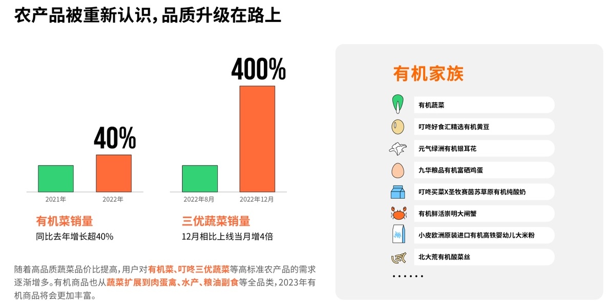 不管是上游日渐成熟的有机蔬菜,还是叮咚买菜针对十几种易引发农残的单品,订单种植出的“三优蔬菜”,销量都在增多。截至目前,叮咚买菜三优蔬菜12月的销量,相比8月份初上线时销量增长4倍;有机商品也从蔬菜扩展到了肉蛋禽、水产海鲜、粮油副食等全品类。