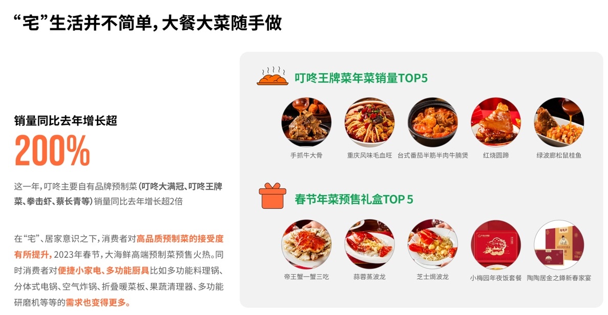 叮咚买菜平台就显示,过去一年叮咚买菜主要自有品牌预制菜(包括叮咚大满冠、叮咚王牌菜、拳击虾、蔡长青等)销量同比去年增长超2倍。线上渠道也帮很多线下大牌餐饮门店将拿手菜送到食客们的家中。而眼下临近春节,各大平台年菜预制菜也已经开启预售或现售,还有很多用户还在叮咚买菜购买了高端大海鲜预制菜,比如帝王蟹一蟹三吃、蒜蓉蒸波龙等“硬菜”,准备在春节与亲朋好友分享。