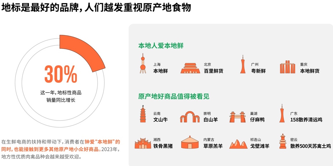 此外,人们对地方性的地标特色蔬菜/肉禽的信任不减,更多地标特色生鲜都通过线上渠道被更多消费者所熟知,比如叮咚买菜平台过去一年就通过高效的供应链,助力国产传统品种黑毛猪/土猪、云南文山牛、崇明白山羊等众多地方性肉禽品种走出“本地”。