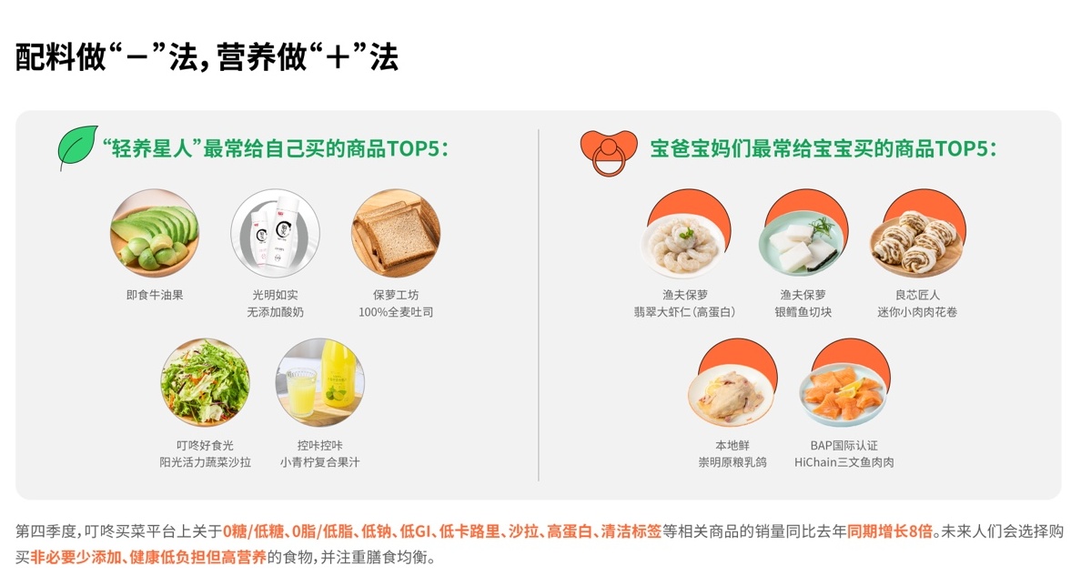 叮咚买菜也在过去一年扩充了以“非必要不添加/少添加”为标准的“清洁标签”商品,并为叮咚买菜的细分用户筛选了更多能够减轻饮食负担的SKU。整个第四季度,叮咚买菜平台上关于0糖/低糖、0脂/低脂、低钠、低GI、低卡路里、沙拉、高蛋白、清洁标签等相关商品的销量同比去年同期增长8倍。