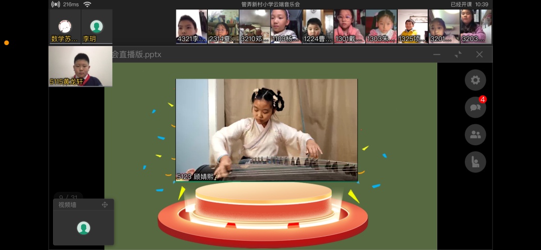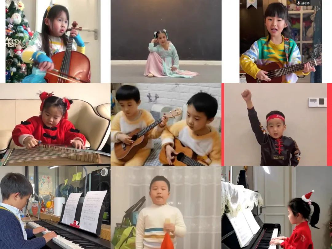 钢琴、架子鼓、古筝、吉他演奏,还有舞蹈表演,孩子们在摄像头下展示着才艺,直播教室里掌声不断。
