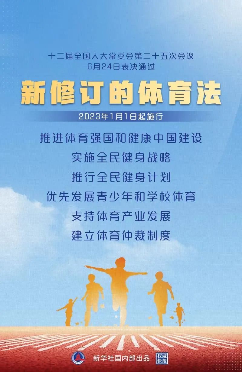 优先发展青少年和学校体育《中华人民共和国体育法》由十三届全国人大常委会第三十五次会议修订通过,自2023年1月1日起施行。新修订的《体育法》明确国家实施全民健身战略,构建全民健身公共服务体系,鼓励和支持公民参加健身活动;将青少年和学校体育置于优先发展的战略地位,明确要求学校必须开齐开足体育课,确保体育课时不被占用,保障学生在校期间每天参加不少于一小时体育锻炼;明确了国家发展体育产业的基本立场和具体措施,在总则中规定国家支持体育产业发展;明确国家建立体育仲裁制度,及时、公正解决体育纠纷等。