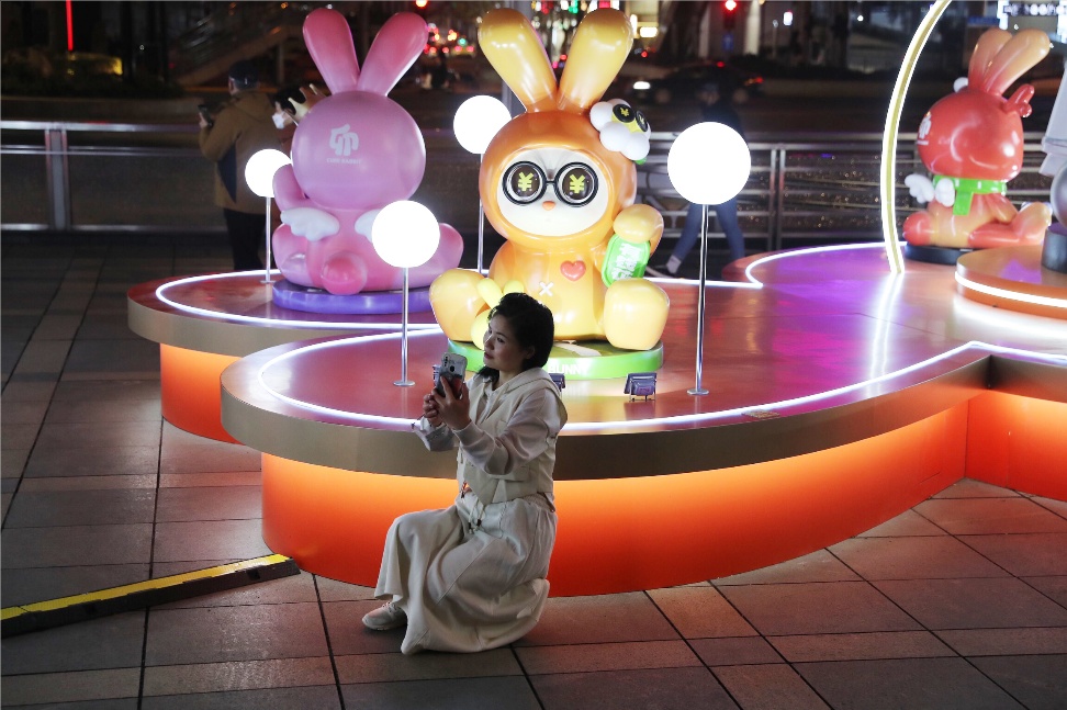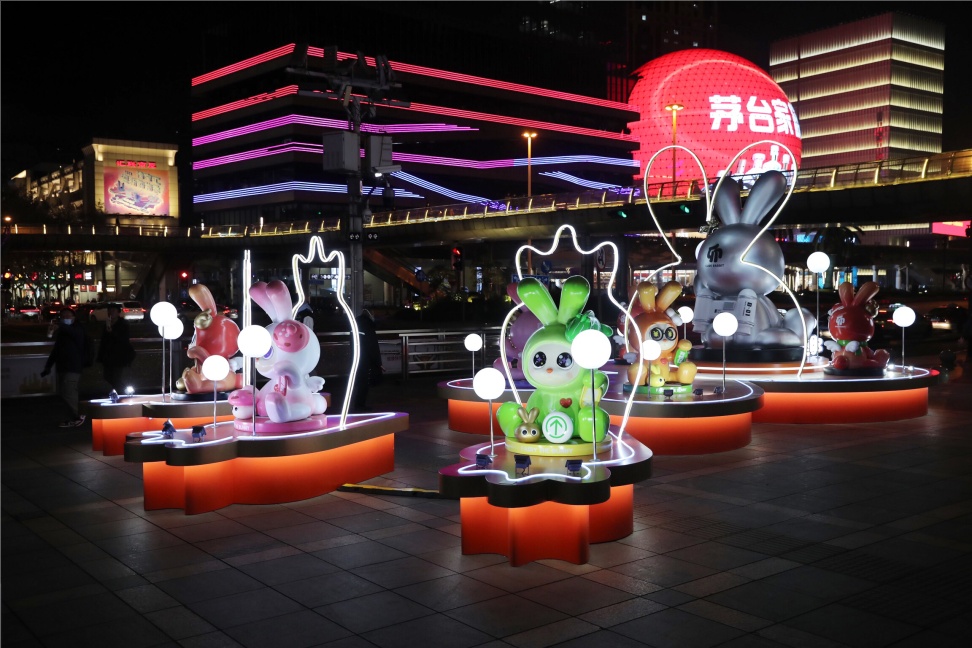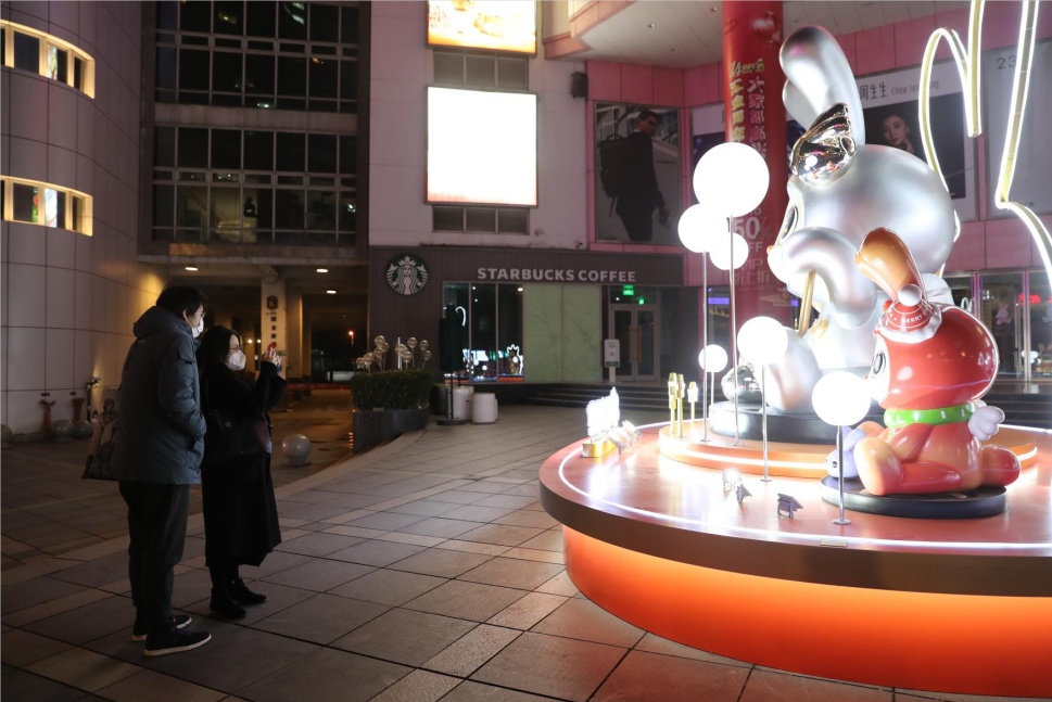 在汇金百货门前,八只萌兔的原创IP装置也为2023兔年的到来增添了喜庆。每只小兔换上不同的新衣,在柔和的白球灯下,乖巧地坐立。每只小爪子都握着属于它们的标签,结合了今年的流行词汇,如“绿马”“菇勇”“元气”等,为即将过去的2022年画上圆满的句号。许多逛街的市民纷纷上前合影留念,为新年讨个吉利。