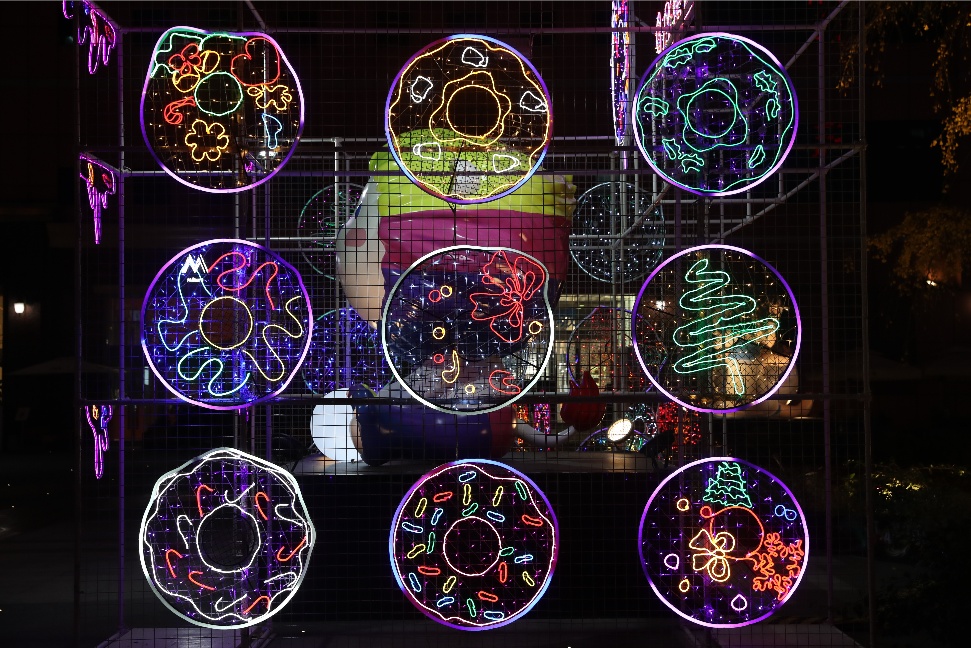 “甜甜圈”样式的彩色霓虹遍布各处,让甜蜜与幸福从这里弥漫开来。