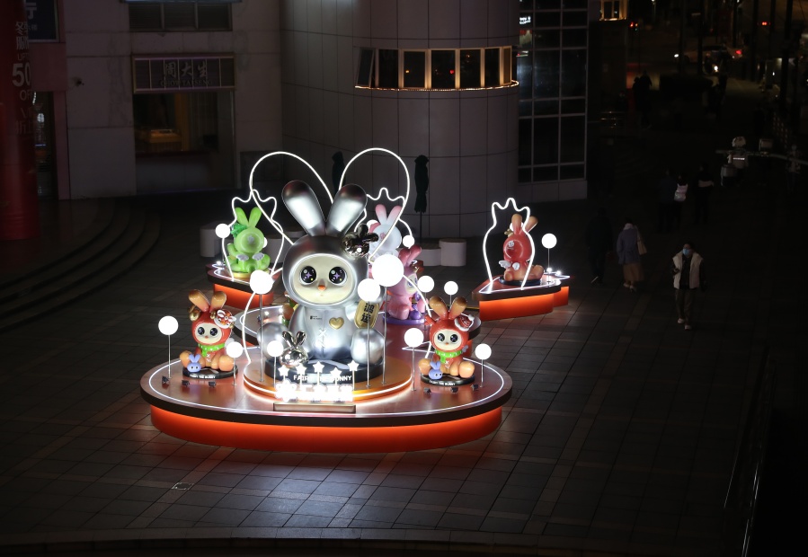 去年迎新,一组憨态可掬的生肖萌虎令人难忘,今年的萌兔则带着各自的祝福为来往的市民传播福气。最大的“鸿运兔”祝福大家鸿运齐天万事如意,眼睛画着金币的“有钱兔”祝福大家财气冲天好运无穷。这也令即将迎来本命年的市民感到格外亲切。