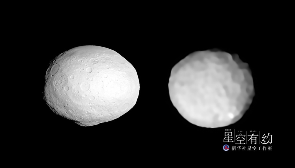 美国宇航局喷气推进实验室与亚利桑那大学的科学团队基于现有观测数据制作的智神星模型图(左图);欧洲南方天文台拍摄的智神星(右图)。