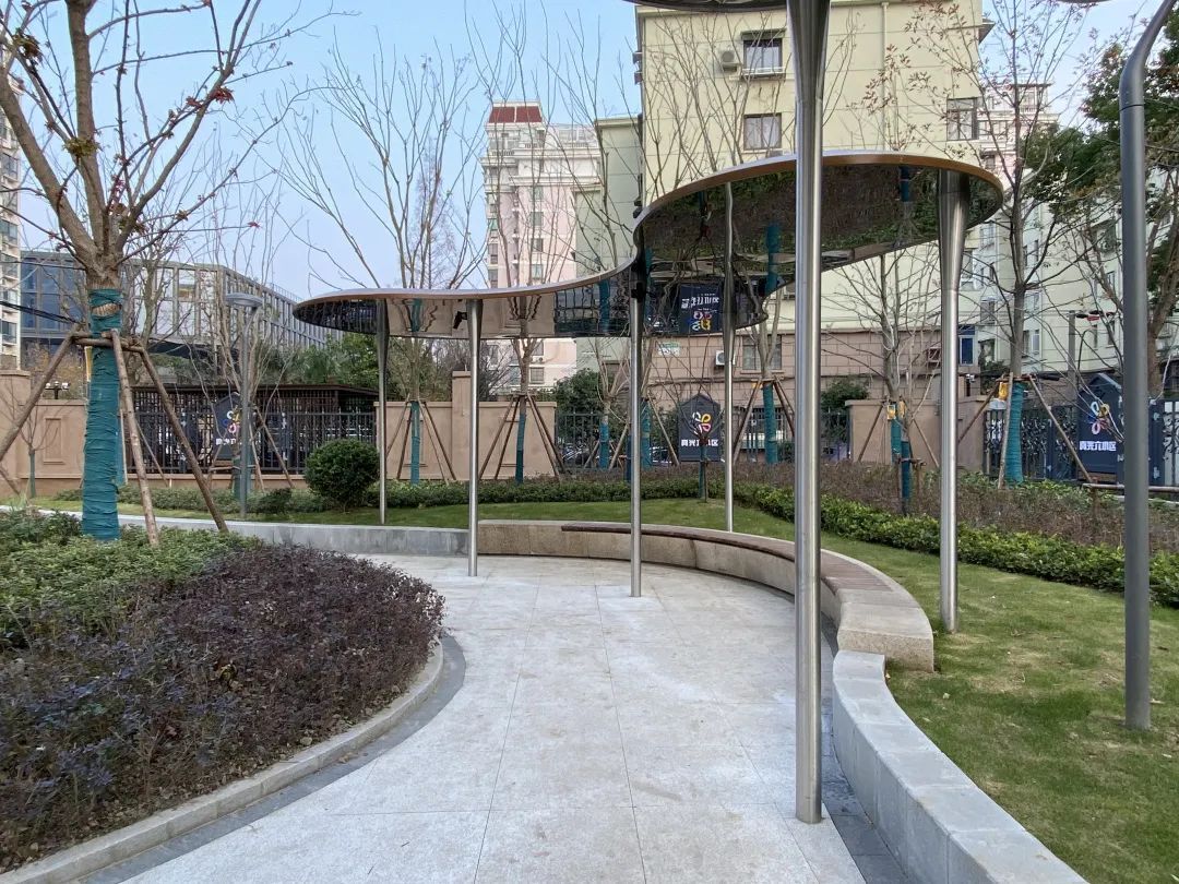 花园以流线型花坛和花岛为主要空间特色,在功能上结合花坛造型设置了座椅,营造了邻里休憩交谈的小空间,特色叠影镜亭与乔木构成光影走廊,为空间增添了一丝灵动。植物搭配上以彩叶树种为主,如五角枫,其绚丽的颜色、优美的造型为花园增色不少。
