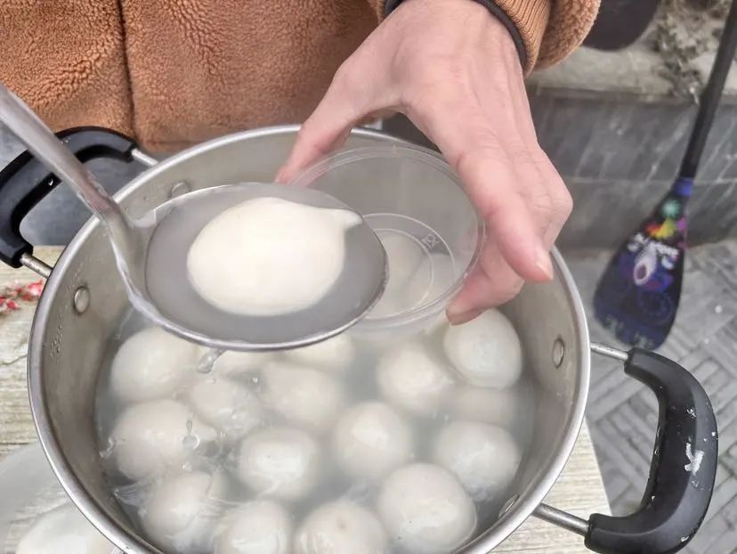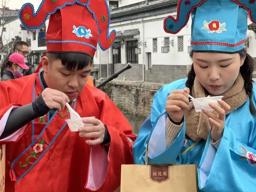 中午时分,桨手们在罗店古镇登上大通桥休憩。品味着店家们送上的罗店非遗美食:一碗软糯可口、圆滑Q弹的罗店鱼圆,一块“清廷贡品”、入口即化的天花玉露霜,一碗热气腾腾的手工汤圆,传递着新年美好的祝福。“运动之后吃碗热乎乎的传统罗店鱼圆,更开胃!”“祝愿所有的人都能够平安顺遂。2023年会是全新的开始,加油!”