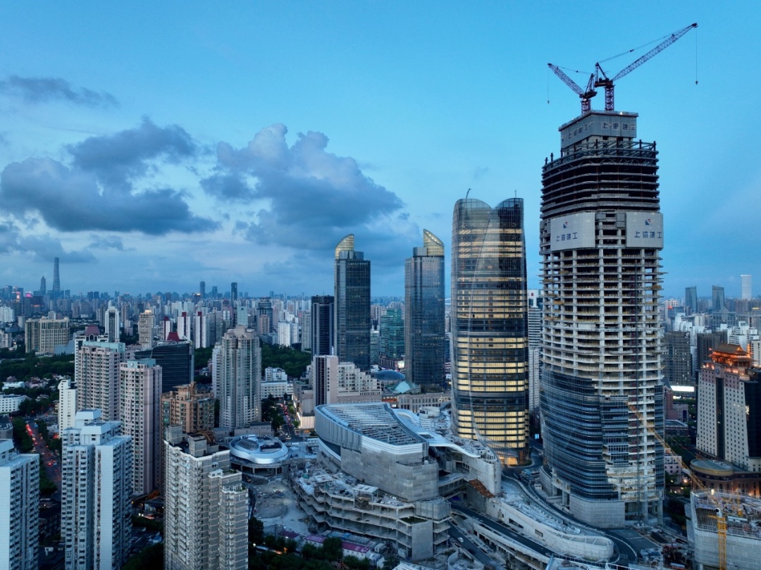 面对超深、超高、超复杂难题,上海建工集团总承包部协同一建集团、安装集团和装饰集团等,将先进的BIM技术和独创的自动监控系统等应用于工程建设之中,确保工程建设对周边环境的影响降到最低。同时,整体钢平台模架与大型塔机、新型智能布料系统、施工升降机一体化集成,实现施工现场各类机械设备的协同工作,大幅提升了施工现场工作效率。2022年,建设者还全力克服疫情、夏季连续高温等困难,终于实现了T2塔楼核心筒封顶目标。