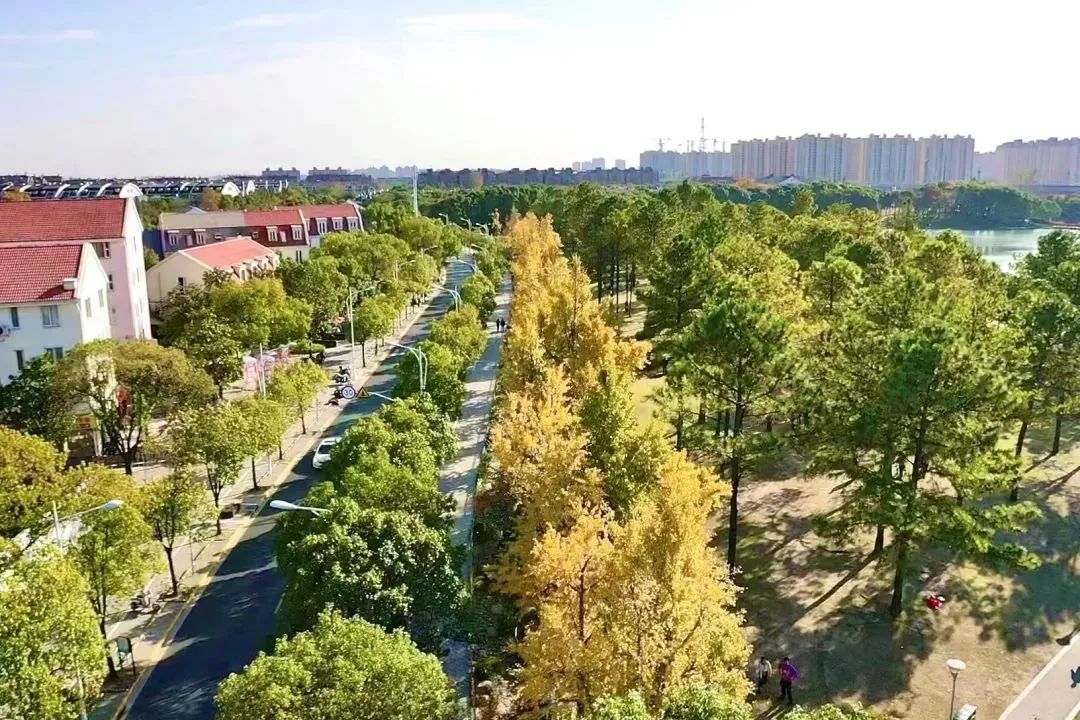 金黄银杏、苍翠的松树、四季常青的香樟将罗芬路与美兰湖绿地景观无缝融合,编织出这个季节独有的缤纷景观带。
