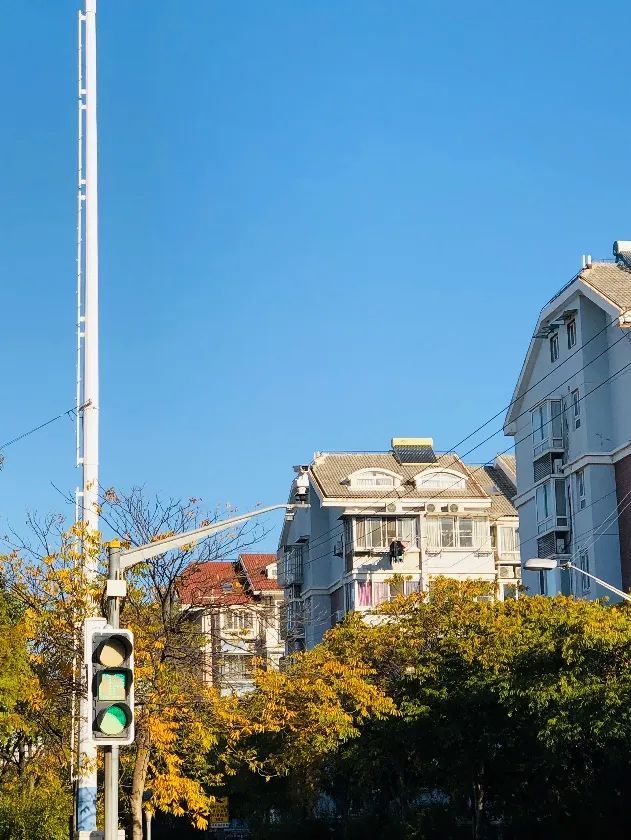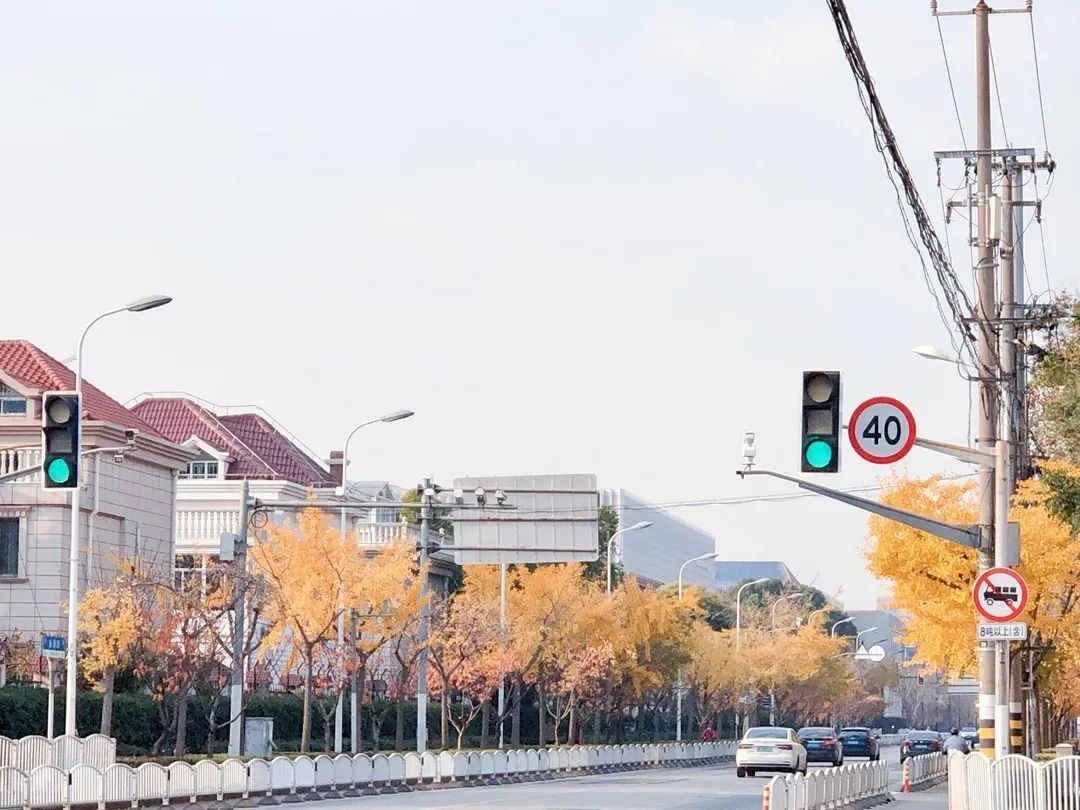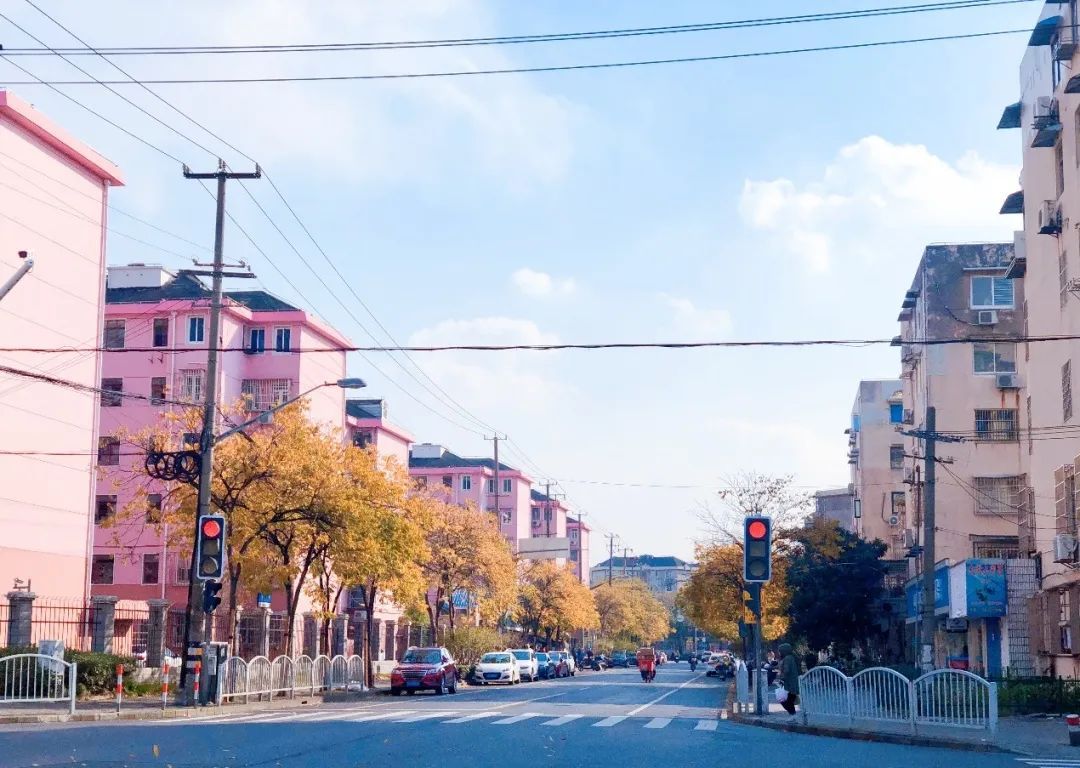 青黄相接的行道树,粉色米色的居民楼,行驶而过的车辆,这条充满生活气的马路在暖阳下显得生动又鲜活。