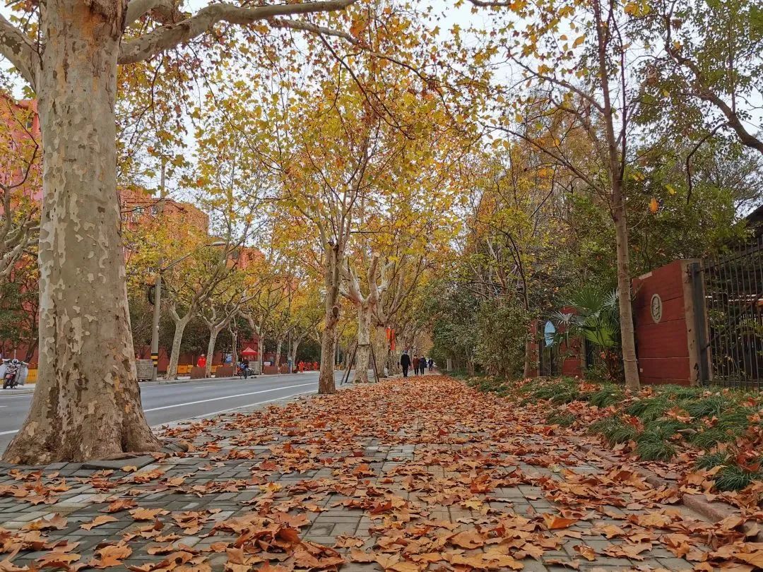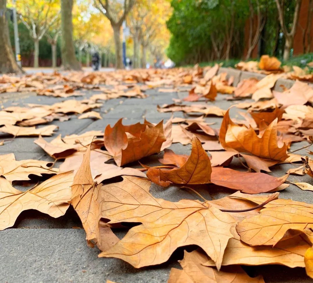 人行道上是从树枝间掉落下的层叠的悬铃木叶,踩在上头还会沙沙作响,用感官奏响了落叶圆舞曲。