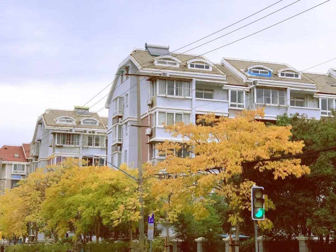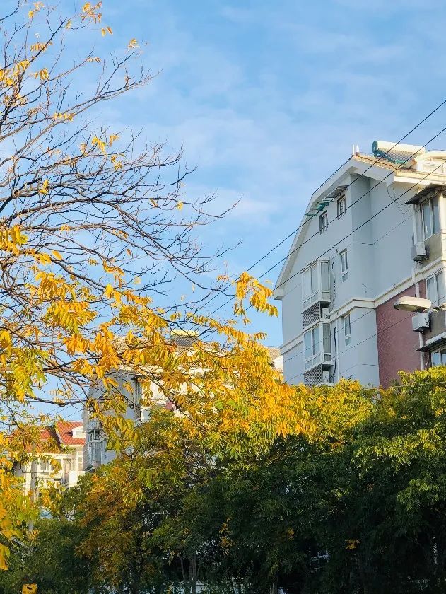 阳光西斜,透过叶片隙缝还能瞥见蓝天与粉色的住宅楼,像一幅精心调色后的画卷,浓墨重彩。