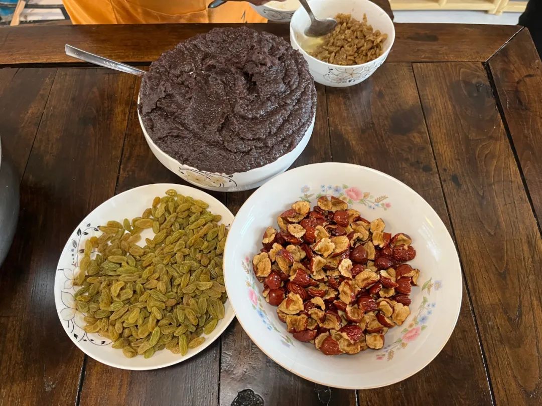 黄素英阿姨准备好所有材料,开始装盘,碗里码每一层的时候一定要压实,用猪油蒸出来的八宝饭更香软;摆造型的干果可以用各种自己喜欢的,不限于葡萄干、李子干。馅料只做了简单的豆沙,黄阿姨说:“做几个葡萄干多的留给孩子们,多放一点葡萄干,孩子们喜欢吃。每次放再多都不够,就喜欢挑那软软甜甜的葡萄干吃。”