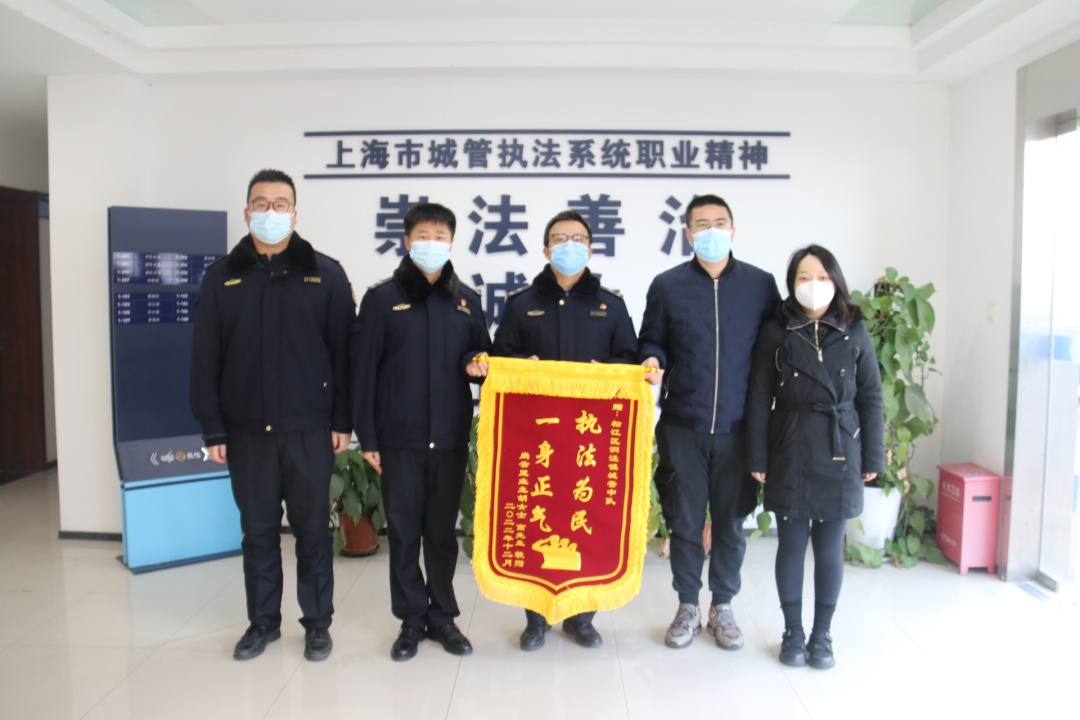 近日,洞泾镇综合行政执法队收到一面写着“执法为民 一身正气”的锦旗。原来是洞泾镇某小区居民为了感谢他们对小区违法建设整治的支持与感谢之情。
