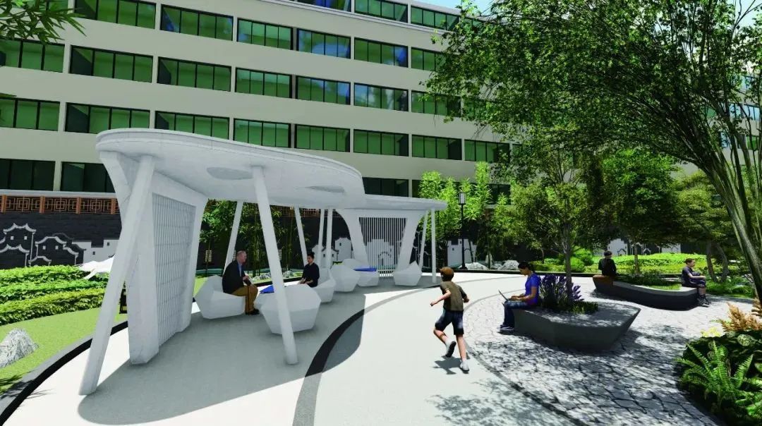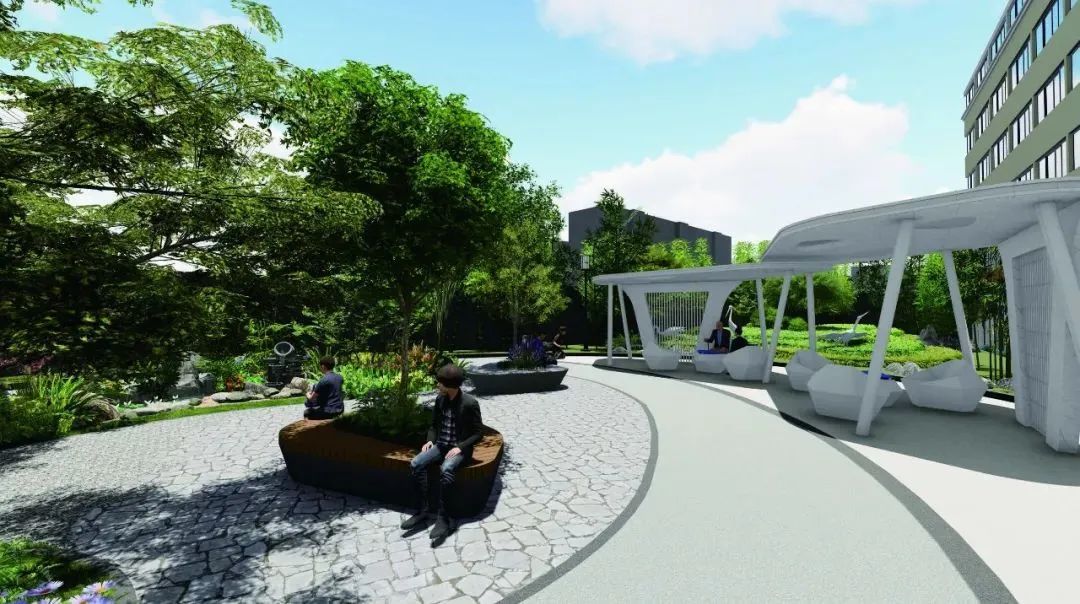 位于主出入口西侧原有的一处休闲广场将重新划分和拓展,改造成融大龄儿童活动区、老年健身休闲区以及低龄幼儿活动区为一体的全年龄段休闲区。儿童活动区增加儿童活动设施以及沙坑、景墙、蹦床等设施,提高场地的氛围感和互动性;增加老年看护人休闲区,四周绿化围绕形成密闭空间,道路连接主路。