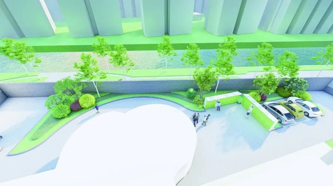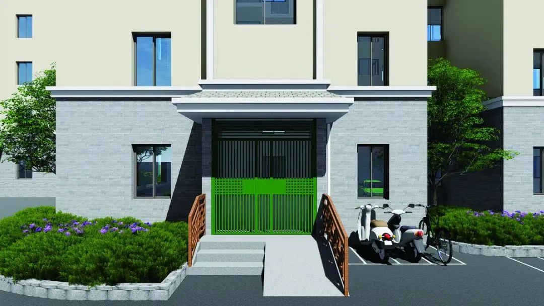 小区主入口作为重要节点规划,将进行岗亭重建,增设快递柜、公告栏、小区平面图、衣物回收柜、归家指路牌、 摄像头等安防和交通设施。通过车行指示灯等手段进行人车分流,新增设非机动车车棚,以及对现有的非机动车停车位进行统一规划。消防入口和南侧入口也将统一规划设计。