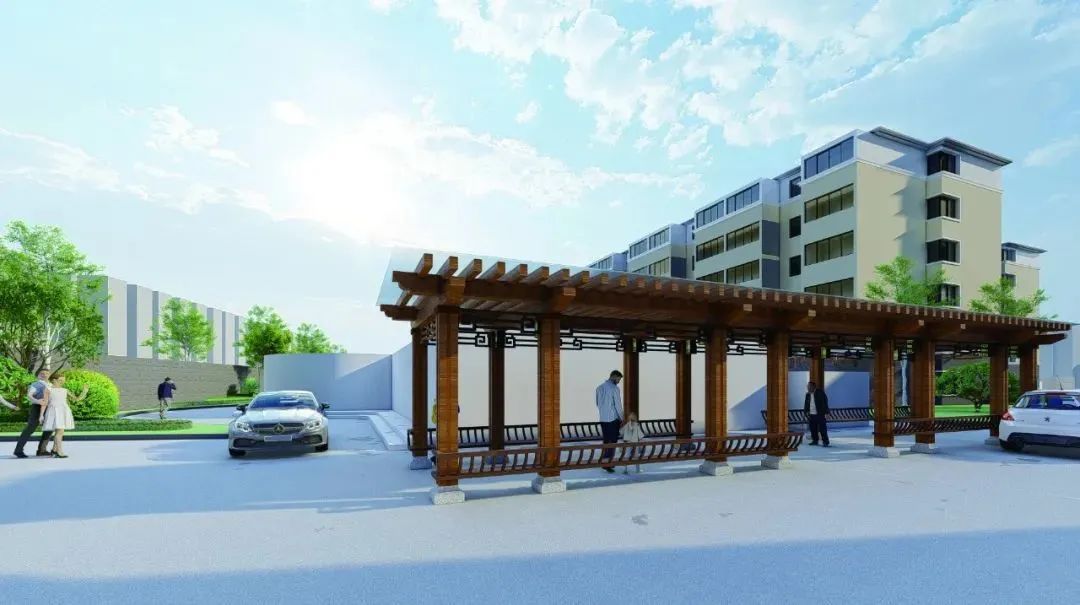 小区东南角有一处作为居民跳广场舞的休闲活动区,本次改造对原有古典廊架进行改建,在保留中式元素的基础上将长廊的位置和材料进行合理化处理。并增设一些停车位,将现有快递柜进行整合处理。
