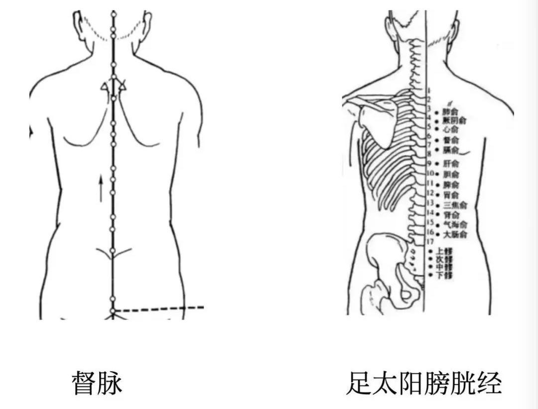 擦督脉、膀胱经:取督脉、膀胱经之循行于胸腰背部一段。擦督脉、膀胱经以扶住阳气,散寒化湿。用掌擦法上下往返操作。先擦督脉,再擦督脉两侧之膀胱经。共约3-4分钟。