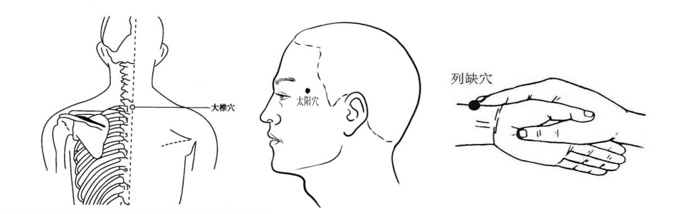 大椎穴:为手足三阳及督脉之会,循督脉上传头颈,既能温通阳气,散寒解表,也可疏风清热,临床用于治疗外感头痛。取穴方法:正坐低头,该穴位于人体的颈部下端,第七颈椎棘突下凹陷处,约与肩平齐。