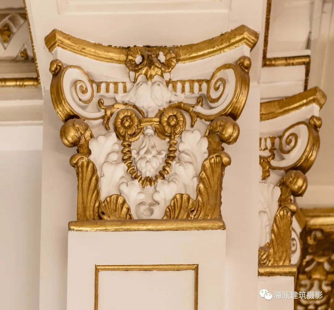 建筑内部装饰呈现出文艺复兴风格,护墙、柱身、楼梯及栏杆等木雕装饰做工精致;室内多处采用繁复的石膏平顶,精美华丽。