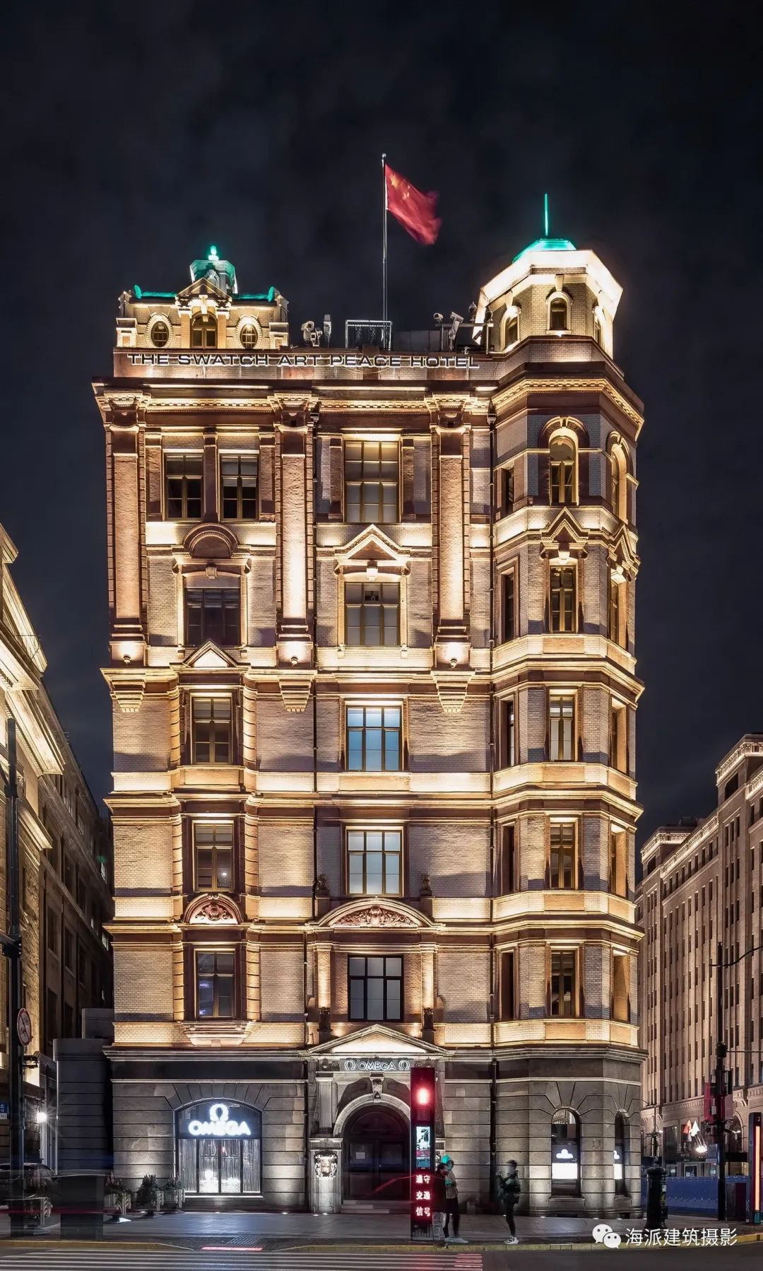 斯沃琪和平饭店艺术中心为英国文艺复兴风格,外墙底层为石砌,以上为白色面砖,楼层间隔线脚,窗口和上部两层窗间为红砖镶砌,红白相间,引人瞩目。
