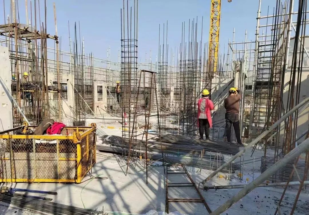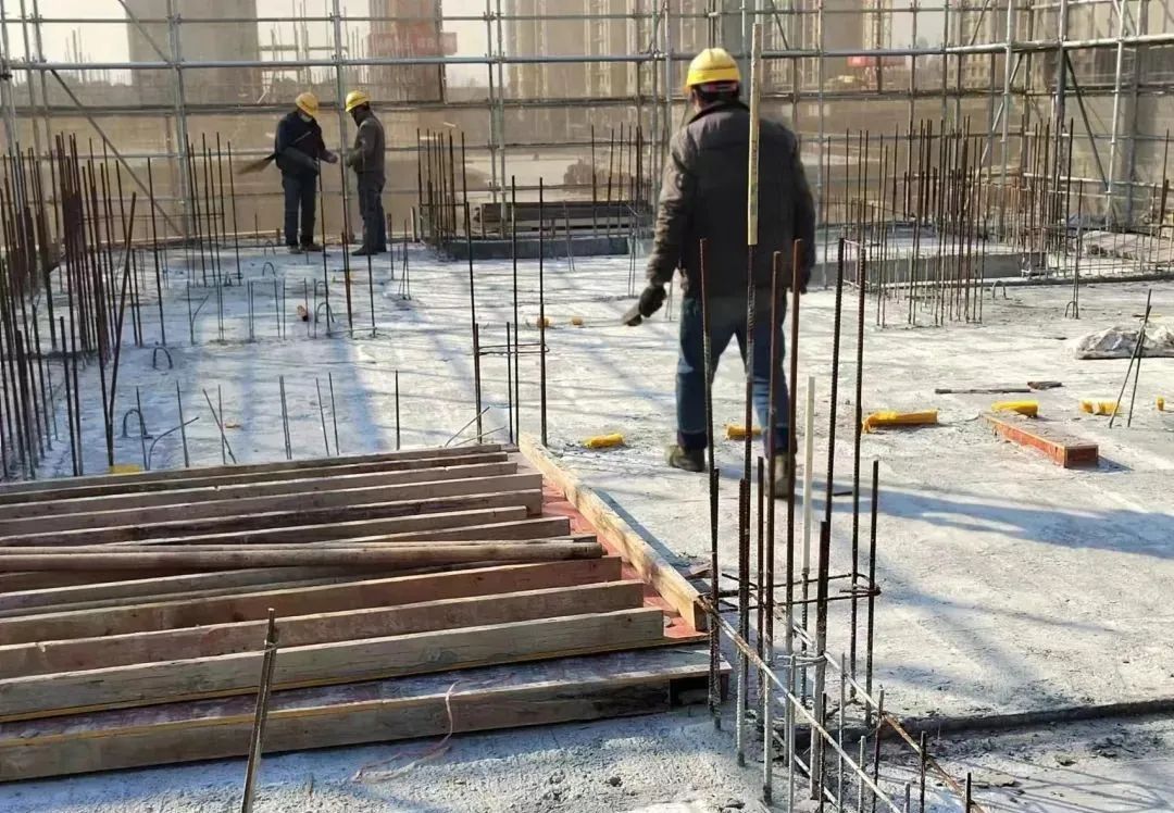 在施工现场,工人们头戴安全帽,在各自所负责的区域有序施工,进行绑扎钢筋、混凝土浇筑、模板支架作业。项目意义重大,工程进度赶得紧,全项目都在争分夺秒抢进度,确保早日交付。