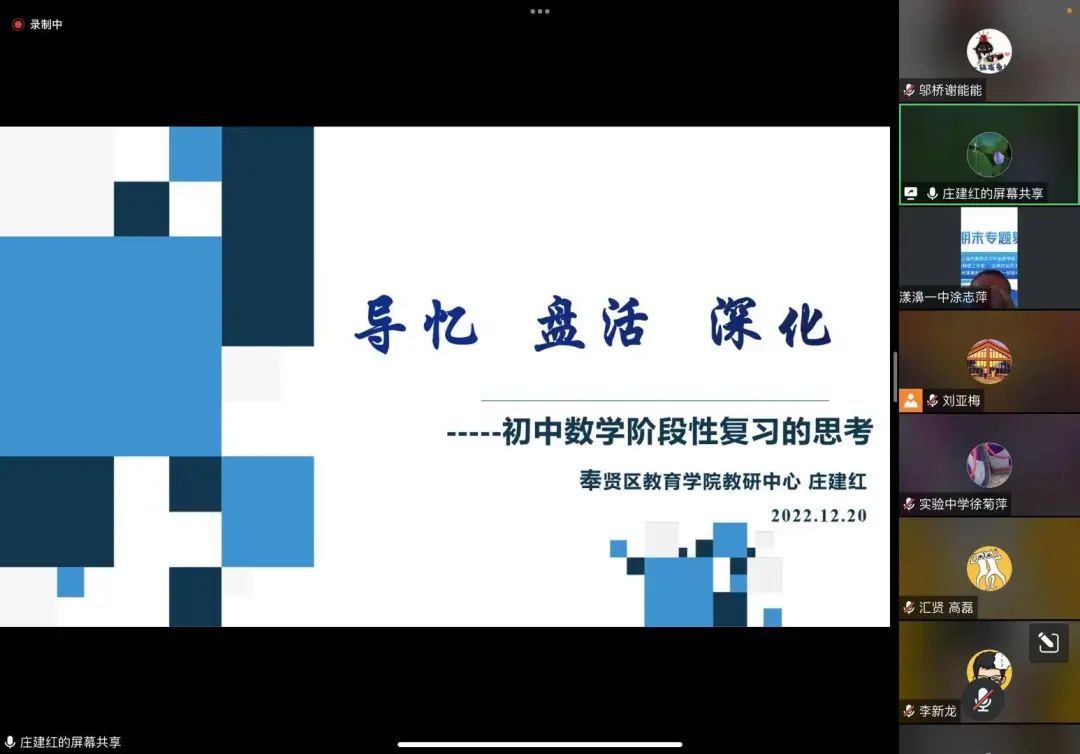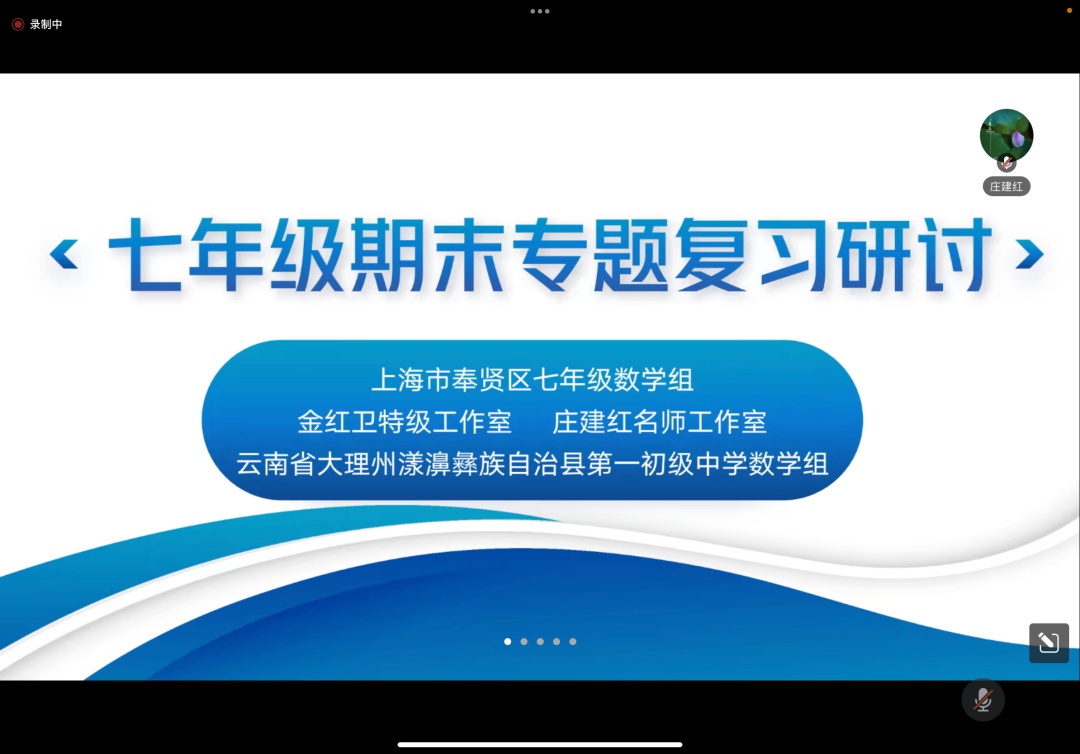 学期接近尾声,为落实期末复习课复习策略,提高复习课教学质效,应云南省大理市漾濞彝族自治县第一初级中学数学组需求,近日,奉贤区七年级数学组、金红卫特级教师工作室、庄建红名教师工作室和云南省大理市漾濞彝族自治县第一初级中学联合开展主题为“七年级数学期末专题复习”线上研讨活动。区教育学院院长蒋东标、副院长金红卫出席活动,区教育学院教研中心副主任庄建红,两个工作室学员、区七年级数学教师、漾濞县第一初级中学教师等参加了活动。活动由区教育学院刘亚梅老师主持。