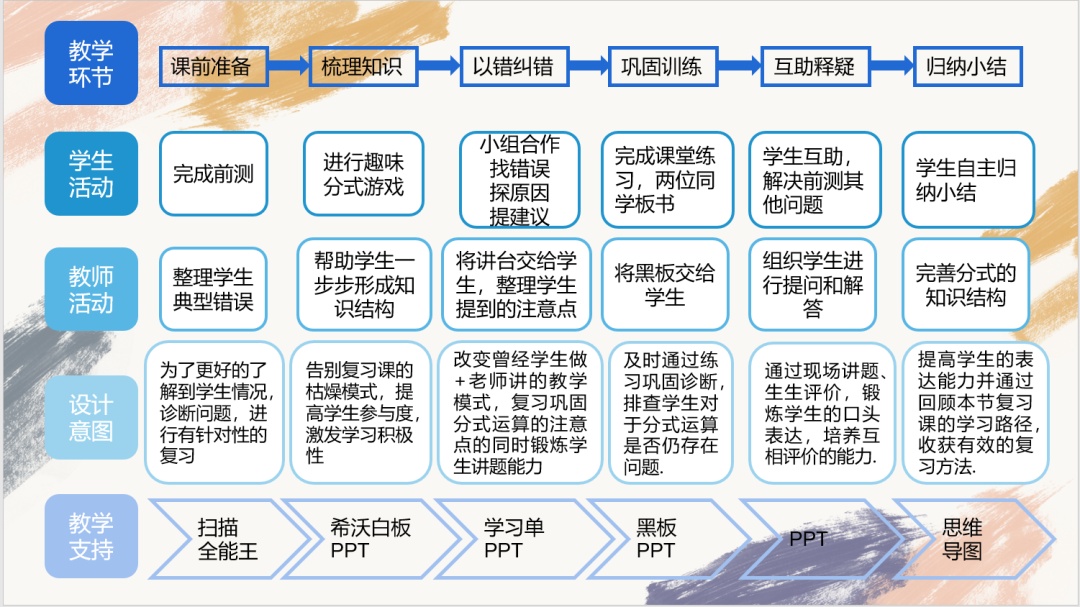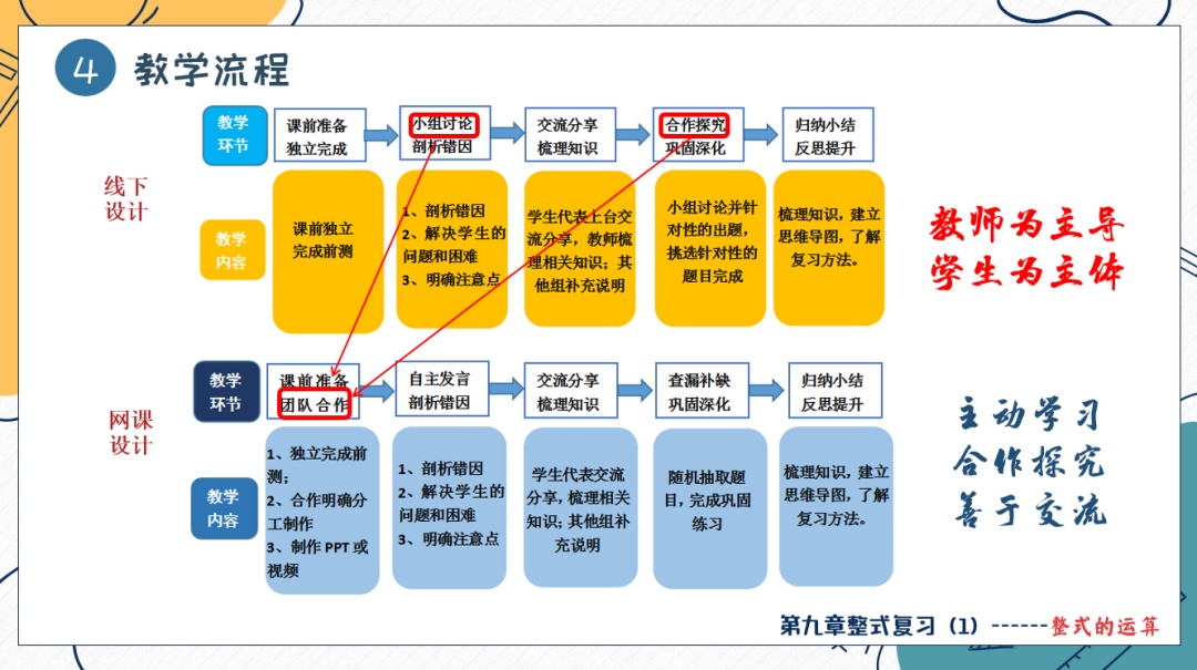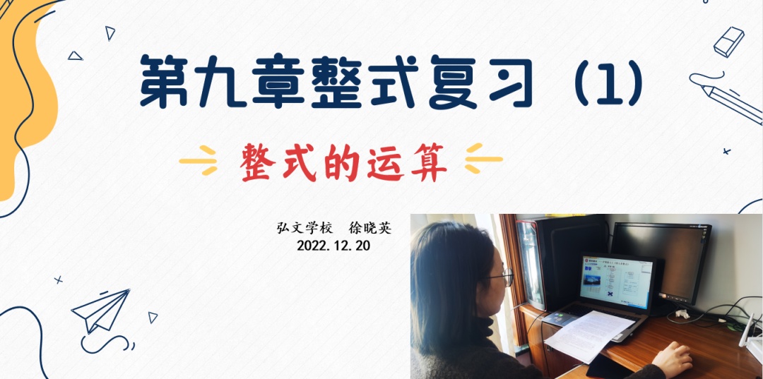 弘文学校教育集团的弘文学校徐晓英老师从教材解析、学情分析、教学目标、教学流程、教学设计、教学反思六部分对《第九章整式专题复习1》进行说课。徐老师通过前测练习发现问题、团队互助解决问题,通过分工合作、小组交流等方法让学生学会自主复习。在课前、课中、课后三个复习环节中,利用错题剖析进一步巩固并理清整式的相关概念、运算法则以及解题的注意点,复习中注重培养学生的数学思维、口头表达能力、自我反思和提升学生解题能力。